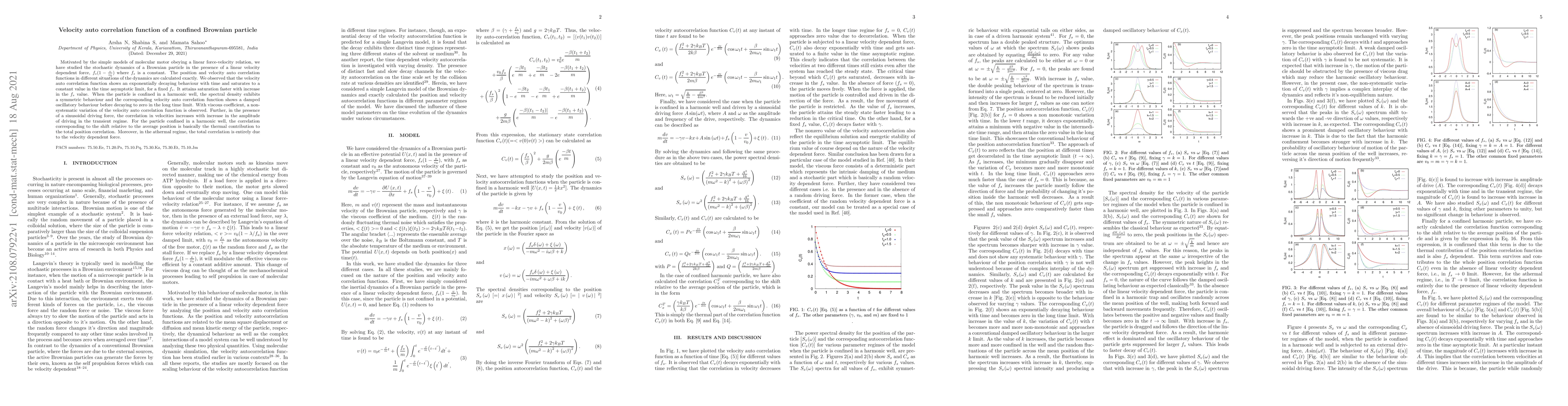 Motivated by the simple models of molecular motor obeying a linear force-velocity relation, we have studied the stochastic dynamics of a Brownian particle in the presence of a linear velocity dependent force, $f_s(1-\frac{v}{v_0})$ where $f_{s}$ is a constant. The position and velocity auto correlation functions in different situations of the dynamics are calculated exactly. We observed that the velocity auto correlation function shows an exponentially decaying behaviour with time and saturates to a constant value in the time asymptotic limit, for a fixed $f_s$. It attains saturation faster with increase in the $f_{s}$ value. When the particle is confined in a harmonic well, the spectral density exhibits a symmetric behaviour and the corresponding velocity auto correlation function shows a damped oscillatory behaviour before decaying to zero in the long time limit. With viscous coefficient, a non-systematic variation of the velocity auto correlation function is observed. Further, in the presence of a sinusoidal driving force, the correlation in velocities increases with increase in the amplitude of driving in the transient regime. For the particle confined in a harmonic well, the correlation corresponding to the shift relative to the average position is basically the thermal contribution to the total position correlation. Moreover, in the athermal regime, the total correlation is entirely due to the velocity dependent force.
