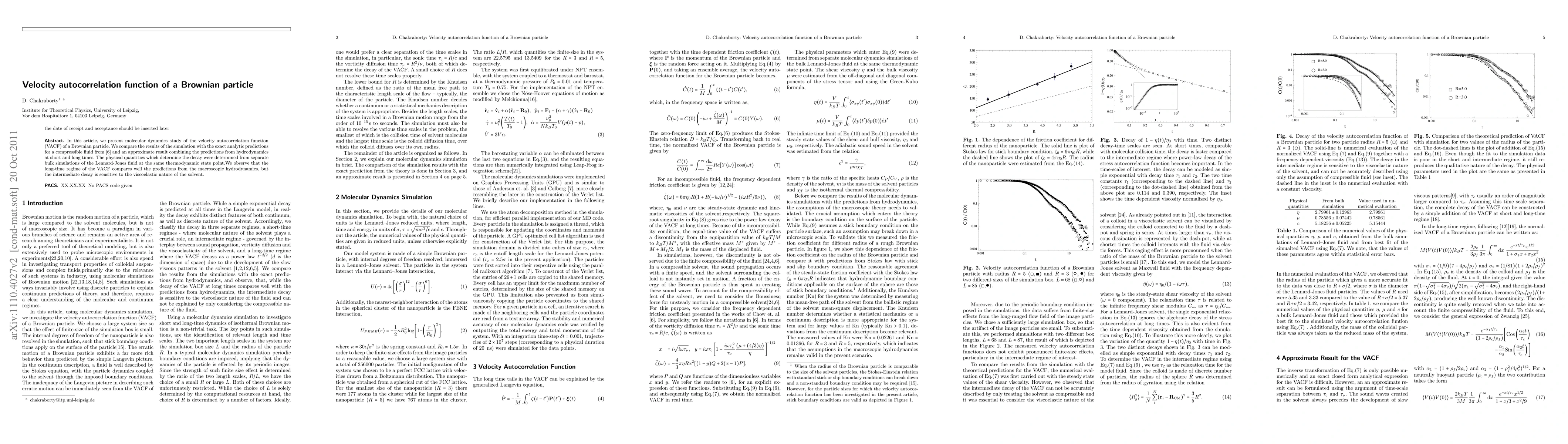 This study uses molecular dynamics to analyze the velocity autocorrelation function (VACF) of a Brownian particle, comparing simulation results with both exact analytic predictions and approximate hydrodynamic models. The long-time regime aligns well with macroscopic hydrodynamics, while the intermediate decay reflects the solvent's viscoelastic properties.