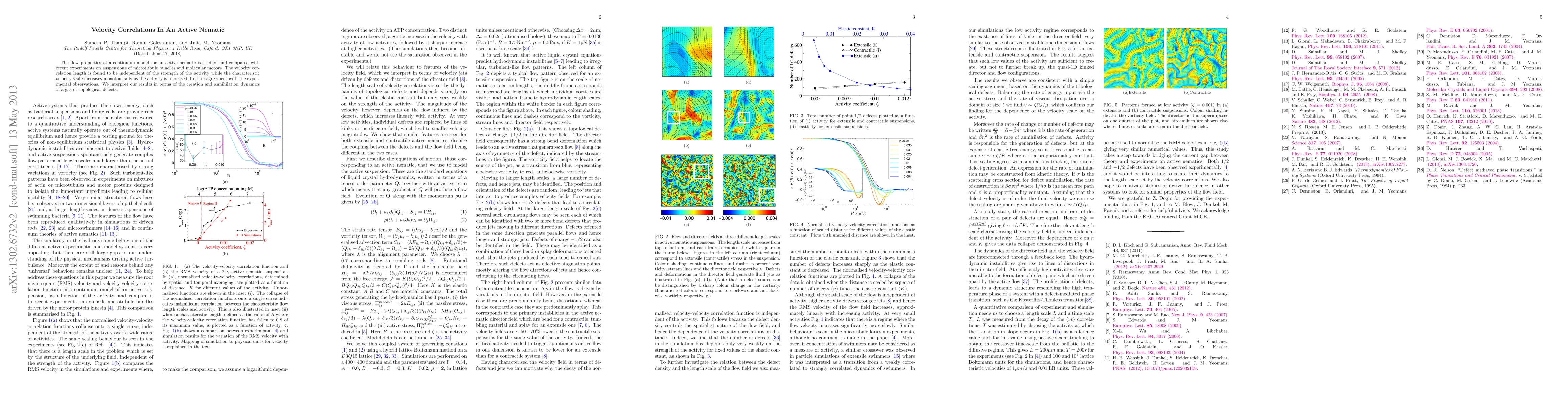The flow properties of a continuum model for an active nematic is studied and compared with recent experiments on suspensions of microtubule bundles and molecular motors. The velocity correlation length is found to be independent of the strength of the activity while the characteristic velocity scale increases monotonically as the activity is increased, both in agreement with the experimental observations. We interpret our results in terms of the creation and annihilation dynamics of a gas of topological defects.