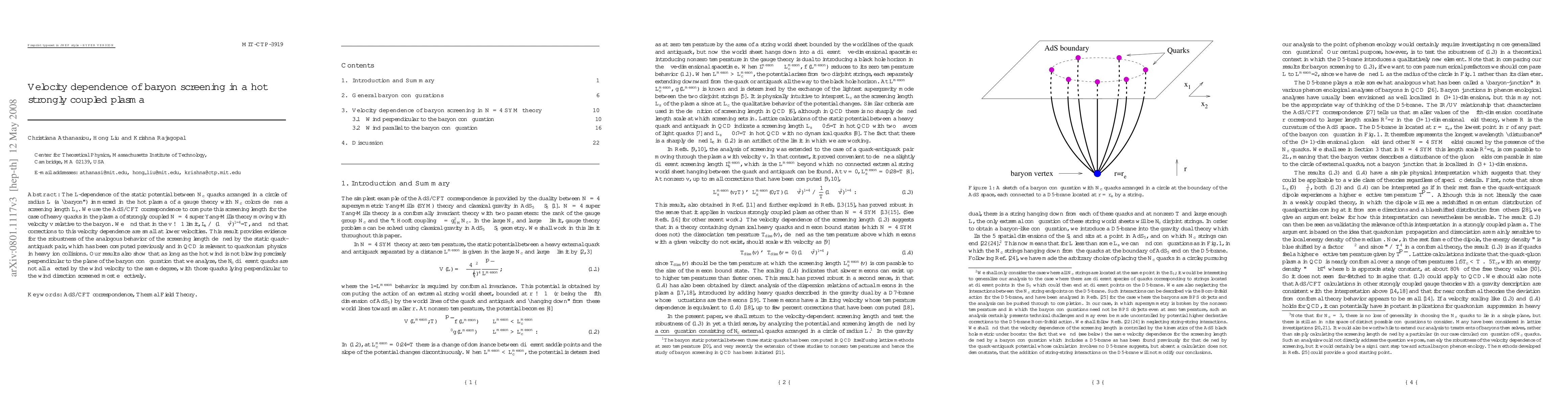 This paper investigates how velocity affects baryon screening in a hot plasma using AdS/CFT correspondence. It finds that the screening length varies with velocity, with corrections becoming smaller at lower velocities.
