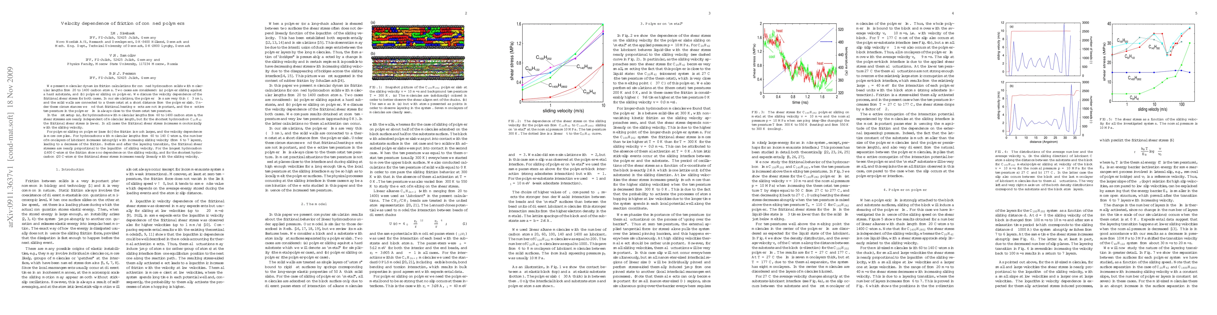 We present molecular dynamics friction calculations for confined hydrocarbon solids with molecular lengths from 20 to 1400 carbon atoms. Two cases are considered: (a) polymer sliding against a hard substrate, and (b) polymer sliding on polymer. We discuss the velocity dependence of the frictional shear stress for both cases. In our simulations, the polymer films are very thin (approx. 3 nm), and the solid walls are connected to a thermostat at a short distance from the polymer slab. Under these circumstances we find that frictional heating effects are not important, and the effective temperature in the polymer film is always close to the thermostat temperature. In the first setup (a), for hydrocarbons with molecular lengths from 60 to 1400 carbon atoms, the shear stresses are nearly independent of molecular length, but for the shortest hydrocarbon C20H42 the frictional shear stress is lower. In all cases the frictional shear stress increases monotonically with the sliding velocity. For polymer sliding on polymer [case (b)] the friction is much larger, and the velocity dependence is more complex. For hydrocarbons with molecular lengths from 60 to 140 C-atoms, the number of monolayers of lubricant increases (abruptly) with increasing sliding velocity (from 6 to 7 layers), leading to a decrease of the friction. Before and after the layering transition, the frictional shear stresses are nearly proportional to the logarithm of sliding velocity. For the longest hydrocarbon (1400 C-atoms) the friction shows no dependence on the sliding velocity, and for the shortest hydrocarbon (20 C-atoms) the frictional shear stress increases nearly linearly with the sliding velocity.