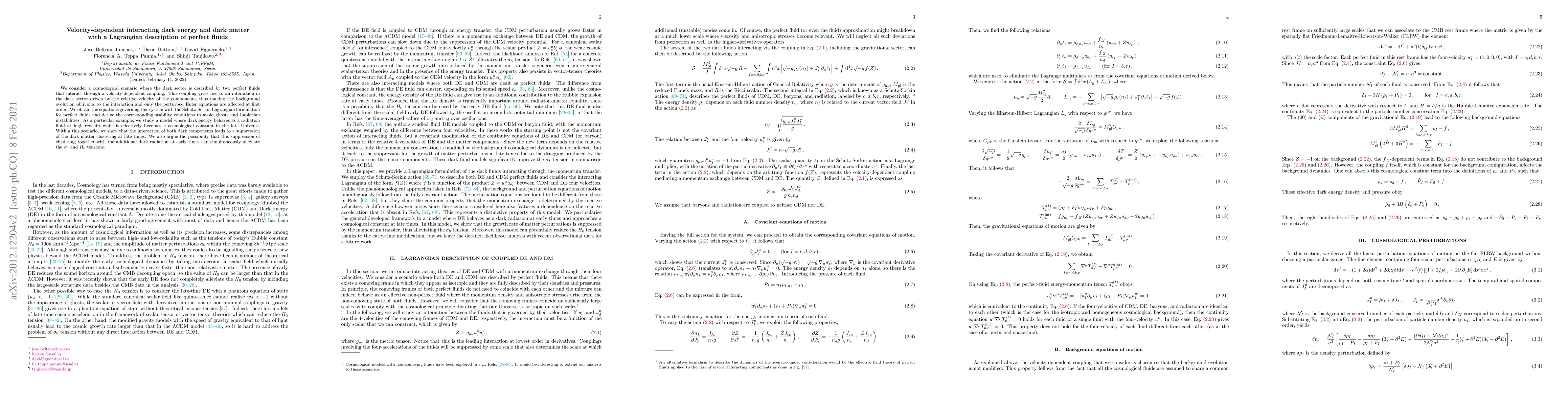 We consider a cosmological scenario where the dark sector is described by two perfect fluids that interact through a velocity-dependent coupling. This coupling gives rise to an interaction in the dark sector driven by the relative velocity of the components, thus making the background evolution oblivious to the interaction and only the perturbed Euler equations are affected at first order. We obtain the equations governing this system with the Schutz-Sorkin Lagrangian formulation for perfect fluids and derive the corresponding stability conditions to avoid ghosts and Laplacian instabilities. As a particular example, we study a model where dark energy behaves as a radiation fluid at high redshift while it effectively becomes a cosmological constant in the late Universe. Within this scenario, we show that the interaction of both dark components leads to a suppression of the dark matter clustering at late times. We also argue the possibility that this suppression of clustering together with the additional dark radiation at early times can simultaneously alleviate the $\sigma_8$ and $H_0$ tensions.