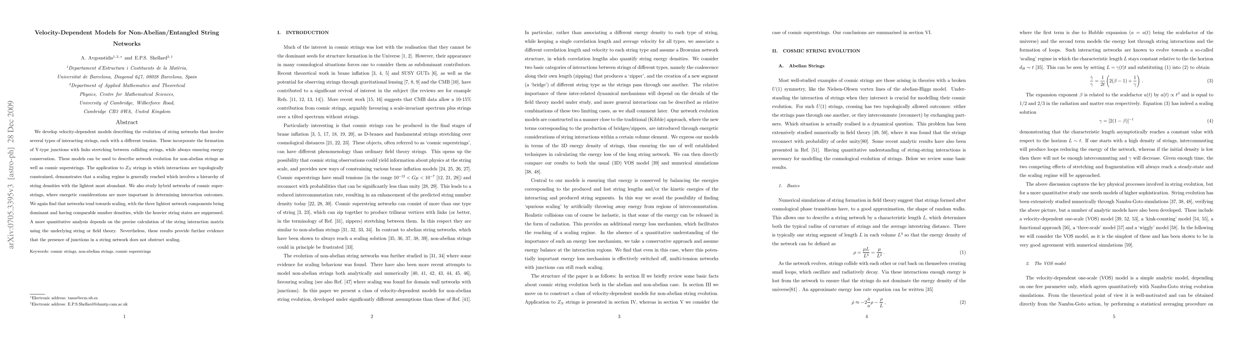 This paper introduces velocity-dependent models for non-Abelian/entangled string networks, which describe how string networks evolve with different tensions while conserving energy. The models show that these networks tend to scale, with the lightest components being dominant in both types of strings.