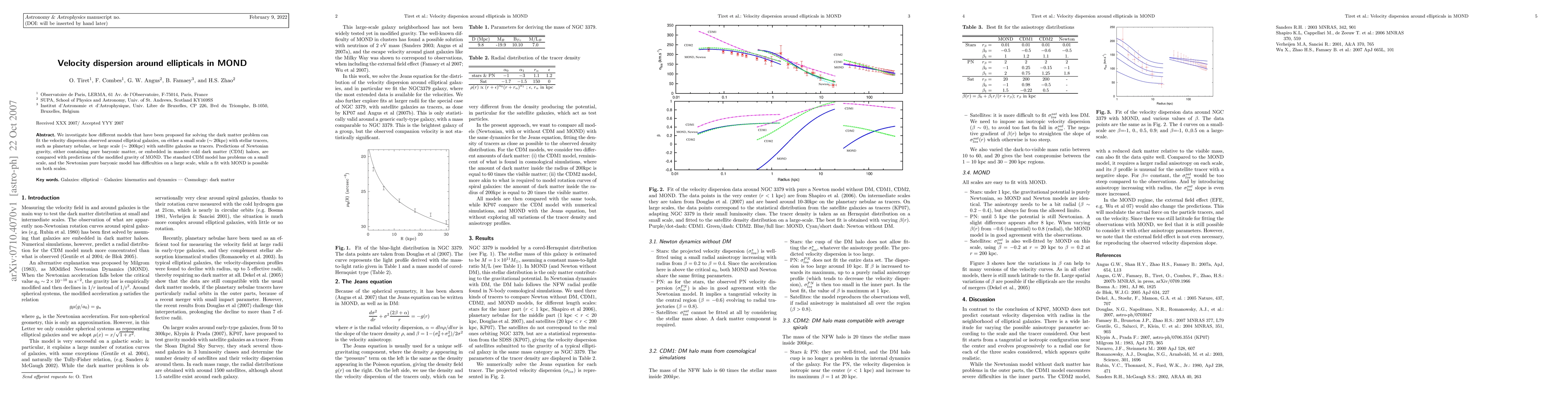 We investigate how different models that have been proposed for solving the dark matter problem can fit the velocity dispersion observed around elliptical galaxies, on either a small scale (~ 20kpc) with stellar tracers, such as planetary nebulae, or large scale (~ 200kpc) with satellite galaxies as tracers. Predictions of Newtonian gravity, either containing pure baryonic matter, or embedded in massive cold dark matter (CDM) haloes, are compared with predictions of the modified gravity of MOND. The standard CDM model has problems on a small scale, and the Newtonian pure baryonic model has difficulties on a large scale, while a fit with MOND is possible on both scales.