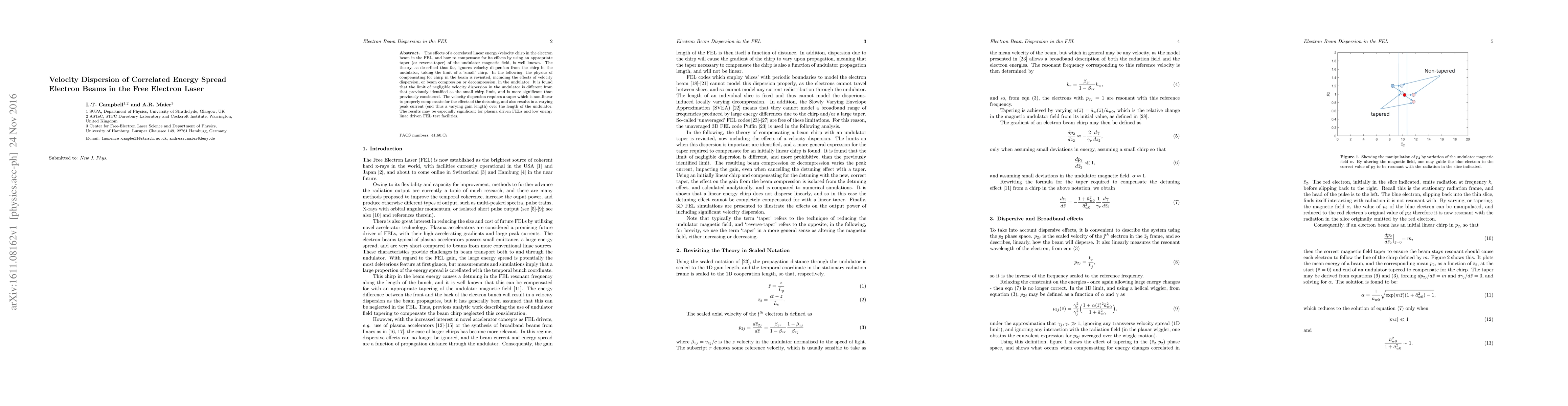 The effects of a correlated linear energy/velocity chirp in the electron beam in the FEL, and how to compensate for its effects by using an appropriate taper (or reverse-taper) of the undulator magnetic field, is well known. The theory, as described thus far, ignores velocity dispersion from the chirp in the undulator, taking the limit of a `small' chirp. In the following, the physics of compensating for chirp in the beam is revisited, including the effects of velocity dispersion, or beam compression or decompression, in the undulator. It is found that the limit of negligible velocity dispersion in the undulator is different from that previously identified as the small chirp limit, and is more significant than previously considered. The velocity dispersion requires a taper which is non-linear to properly compensate for the effects of the detuning, and also results in a varying peak current (end thus a varying gain length) over the length of the undulator. The results may be especially significant for plasma driven FELs and low energy linac driven FEL test facilities.
