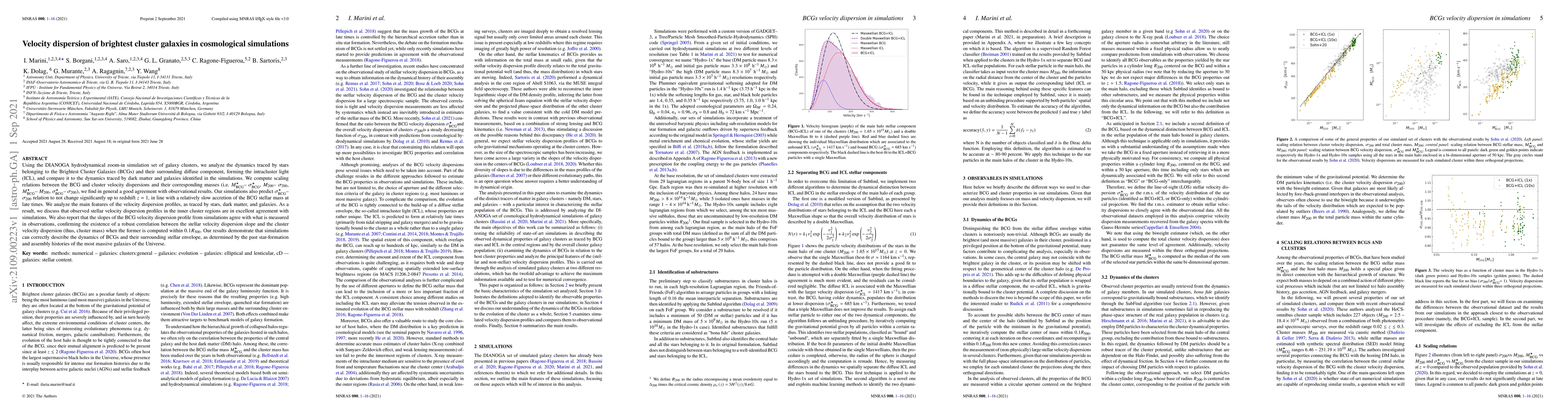 This study uses the DIANOGA simulations to analyze the velocity dispersion of Brightest Cluster Galaxies (BCGs) and their intracluster light, comparing it to dark matter and overall cluster dynamics. The research finds good agreement between simulation predictions and observational data, confirming a robust correlation between BCG stellar velocity dispersion and cluster mass.