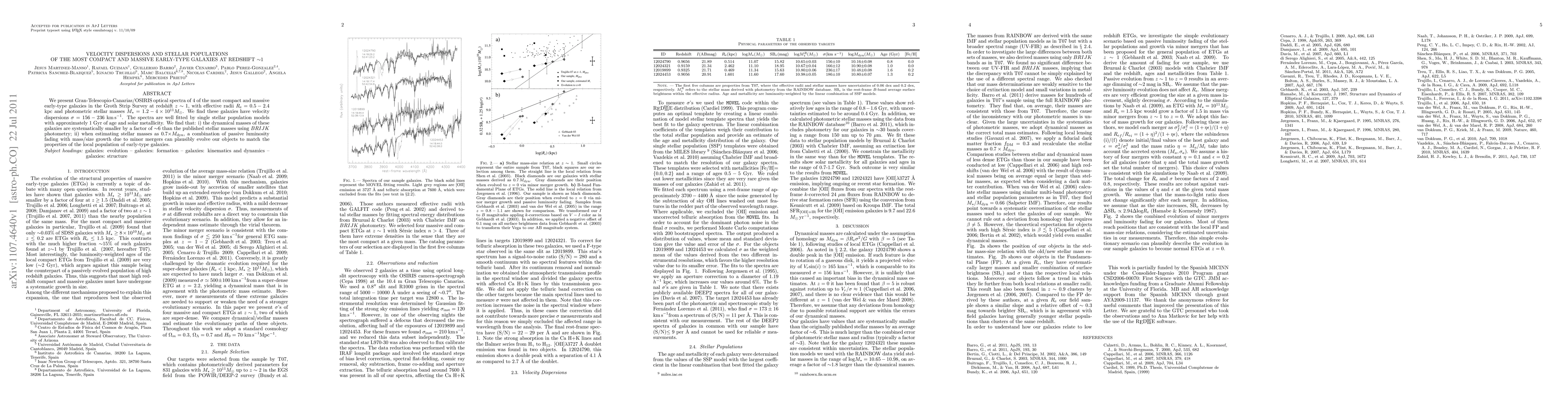 Researchers studied 4 compact, massive early-type galaxies at redshift z~1, finding them to have smaller dynamical masses than stellar masses, suggesting a role for minor mergers in their evolution.