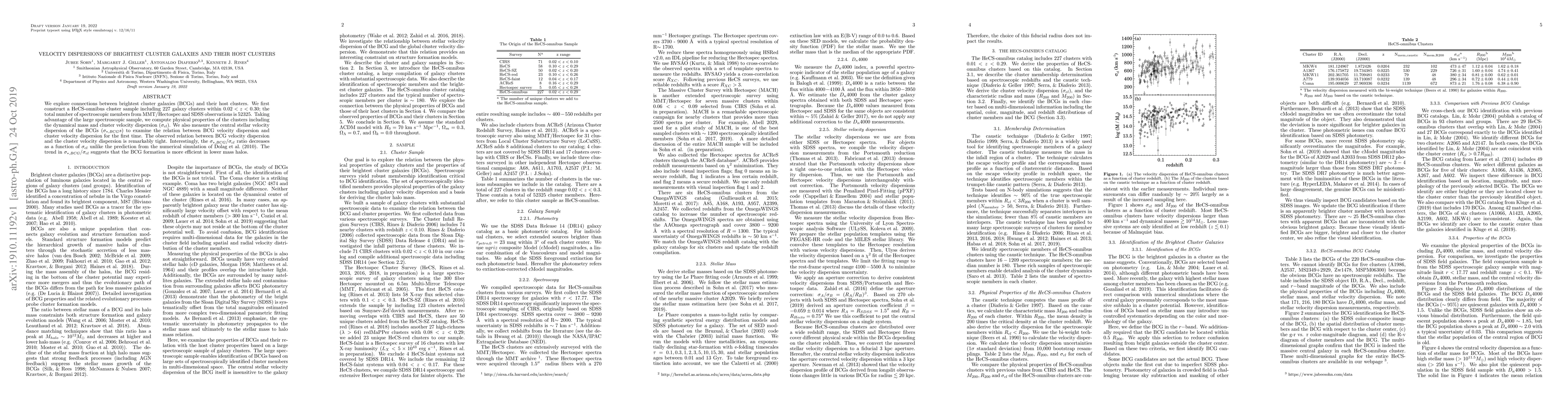 We explore connections between brightest cluster galaxies (BCGs) and their host clusters. We first construct a HeCS-omnibus cluster sample including 227 galaxy clusters within $0.02 < z < 0.30$; the total number of spectroscopic members from MMT/Hectospec and SDSS observations is 52325. Taking advantage of the large spectroscopic sample, we compute physical properties of the clusters including the dynamical mass and cluster velocity dispersion ($\sigma_{cl}$). We also measure the central stellar velocity dispersion of the BCGs ($\sigma_{*,BCGs}$) to examine the relation between BCG velocity dispersion and cluster velocity dispersion for the first time. The observed relation between BCG velocity dispersion and the cluster velocity dispersion is remarkably tight. Interestingly, the $\sigma_{*, BCG} / \sigma_{cl}$ ratio decreases as a function of $\sigma_{cl}$ unlike the prediction from the numerical simulation of Dolag et al. (2010). The trend in $\sigma_{*, BCG} / \sigma_{cl}$ suggests that the BCG formation is more efficient in lower mass halos.