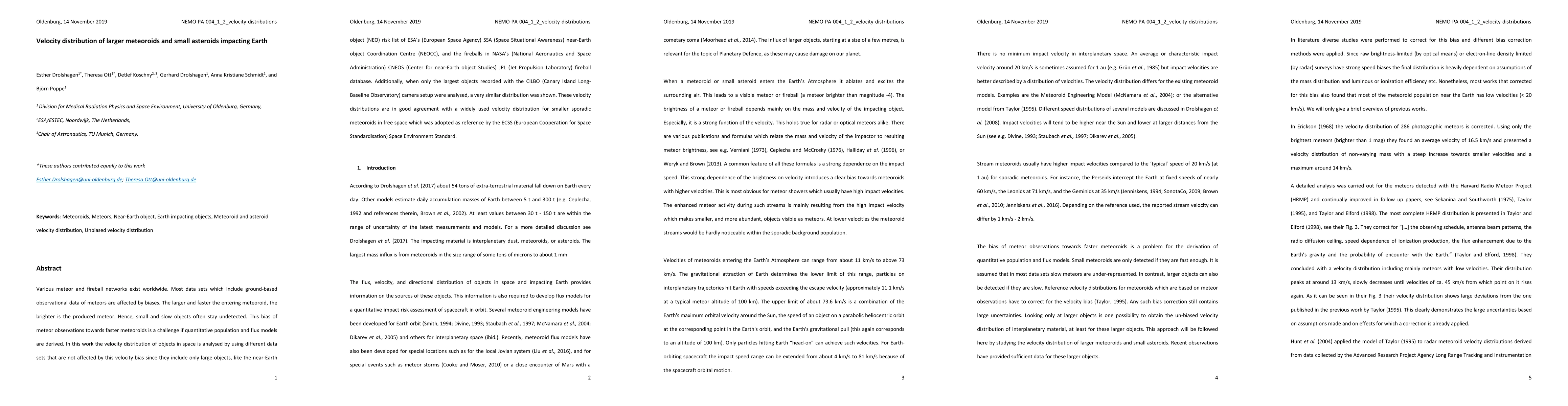 Various meteor and fireball networks exist worldwide. Most data sets which include ground-based observational data of meteors are affected by biases. The larger and faster the entering meteoroid, the brighter is the produced meteor. Hence, small and slow objects often stay undetected. This bias of meteor observations towards faster meteoroids is a challenge if quantitative population and flux models are derived. In this work the velocity distribution of objects in space is analysed by using different data sets that are not affected by this velocity bias since they include only large objects, like the near-Earth object (NEO) risk list of ESA's (European Space Agency) SSA (Space Situational Awareness) near-Earth object Coordination Centre (NEOCC), and the fireballs in NASA's (National Aeronautics and Space Administration) CNEOS (Center for near-Earth object Studies) JPL (Jet Propulsion Laboratory) fireball database. Additionally, when only the largest objects recorded with the CILBO (Canary Island Long-Baseline Observatory) camera setup were analysed, a very similar distribution was shown. These velocity distributions are in good agreement with a widely used velocity distribution for smaller sporadic meteoroids in free space which was adopted as reference by the ECSS (European Cooperation for Space Standardisation) Space Environment Standard.