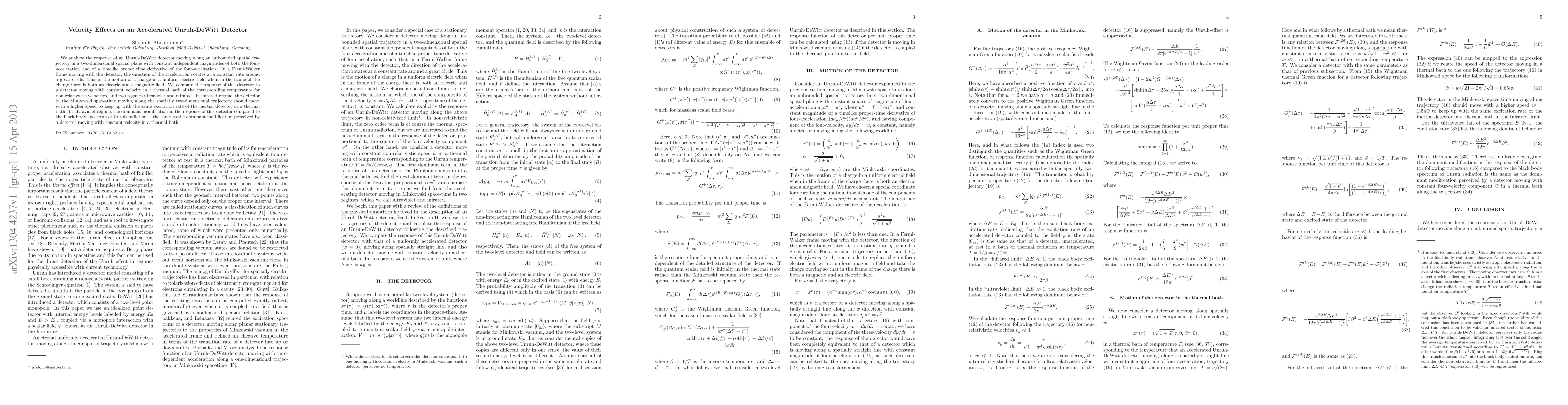 We analyze the response of an Unruh-DeWitt detector moving along an unbounded spatial trajectory in a two-dimensional spatial plane with constant independent magnitudes of both the four-acceleration and of a timelike proper time derivative of the four-accelration. In a Fermi-Walker frame moving with the detector, the direction of the acceleration rotates at a constant rate around a great circle. This is the motion of a charge in a uniform electric field when in the frame of the charge there is both an electric and a magnetic field. We compare the response of this detector to a detector moving with constant velocity in a thermal bath of the corresponding temperature for non-relativistic velocities, and in two regimes: ultraviolet and infrared. In infrared regime, the detector in the Minkowski space-time moving along the spatially two-dimensional trajectory should move with a higher speed to keep up with the same excitation rate of the inertial detector in a thermal bath. In ultraviolet regime, the dominant modification in the response of this detector compared to the black body spectrum of Unruh radiation is the same as the dominant modification perceived by a detector moving with constant velocity in a thermal bath.
