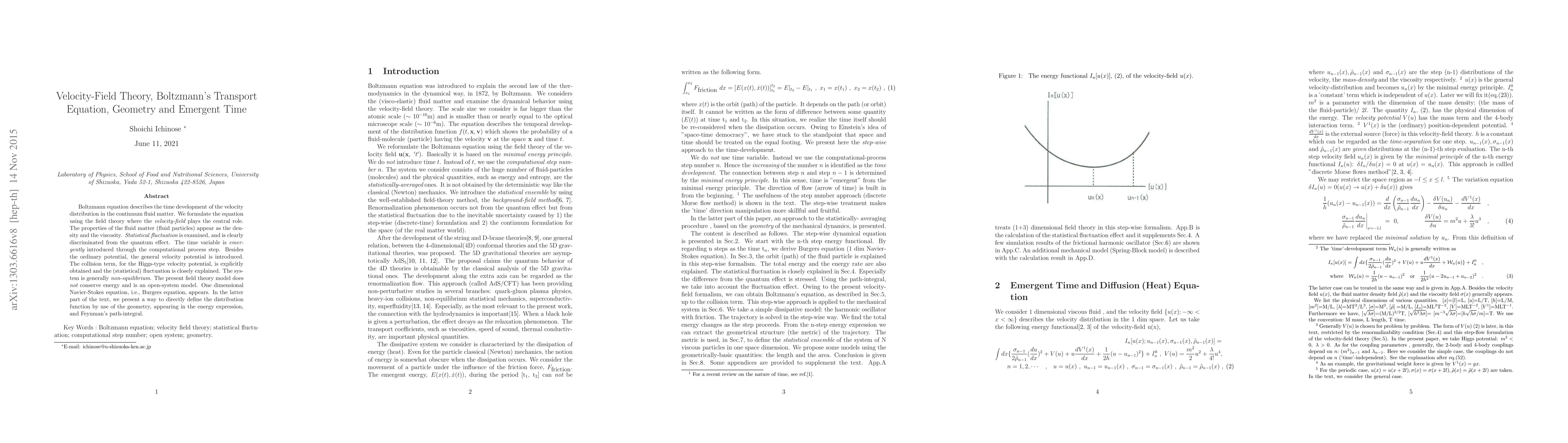 Boltzmann equation describes the time development of the velocity distribution in the continuum fluid matter. We formulate the equation using the field theory where the {\it velocity-field} plays the central role. The properties of the fluid matter (fluid particles) appear as the density and the viscosity. {\it Statistical fluctuation} is examined, and is clearly discriminated from the quantum effect. The time variable is {\it emergently} introduced through the computational process step. Besides the ordinary potential, the general velocity potential is introduced. The collision term, for the Higgs-type velocity potential, is explicitly obtained and the (statistical) fluctuation is closely explained. The system is generally {\it non-equilibrium}. The present field theory model does {\it not} conserve energy and is an open-system model. One dimensional Navier-Stokes equation, i.e., Burgers equation, appears. In the latter part of the text, we present a way to directly define the distribution function by use of the geometry, appearing in the energy expression, and Feynman's path-integral.