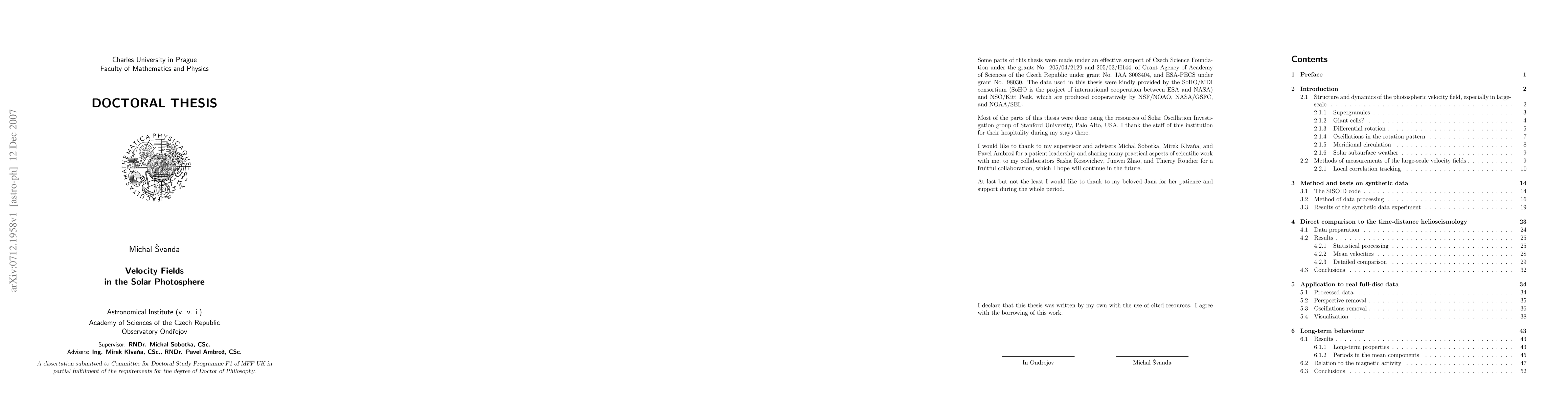 Large-scale velocity fields in the solar photosphere remain a mystery in spite of many years of intensive studies. In this thesis, the new method of the measurements of the solar photospheric flow fields is proposed. It is based on local correlation tracking algorithm applied to full-disc dopplergrams obtained by Michelson Doppler Images (MDI) on-board the Solar and Heliospheric Observatory (SoHO). The method is tuned and tested on synthetic data, it is shown that the method is capable of measuring of horizontal velocity fields with an accuracy of 15 \mps. It is also shown that the method provides the measurements comparable with time-distance local helioseismology. The method is applied to real data sets. It reproduces well known properties of solar photospheric velocity fields. Moreover, the case studies show an evidence about the influence of the changes in the flow field topology on the stability of the eruptive filament and support the theory of the dynamical disconnection of bipolar sunspots from their magnetic roots. The method has a great perspective in the future use. The meridional flux transportation speed is also studied and it is shown that the direct measurement may differ from time-distance local helioseimology in the areas occupied by the strong magnetic field. This result has an impact to the flux transport dynamo models, which use the meridional speed as the essential observational input parameter.
