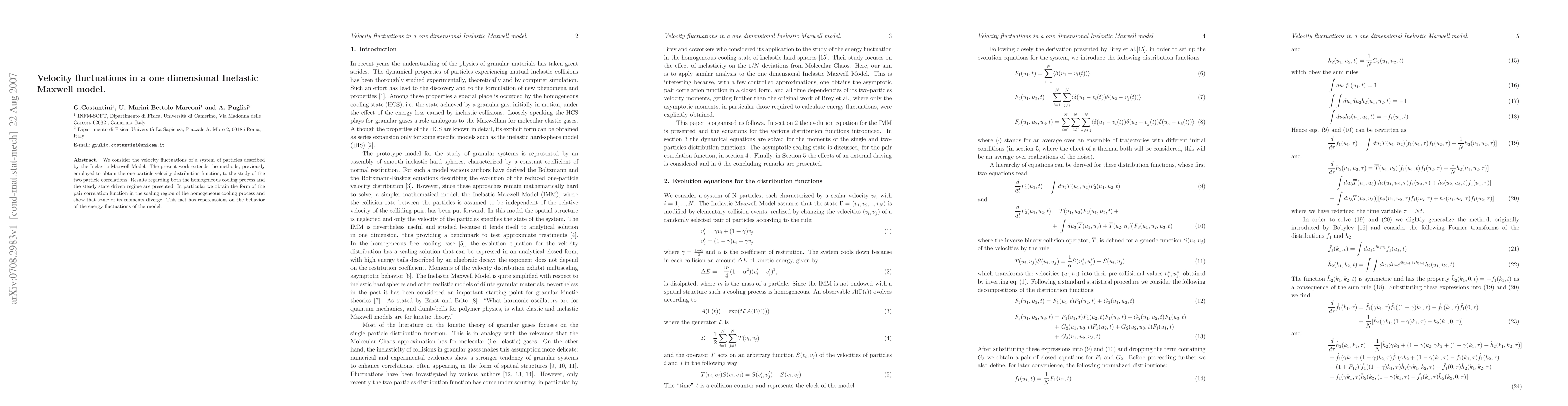 This paper investigates velocity fluctuations in a one-dimensional Inelastic Maxwell model, focusing on two-particle correlations and the homogeneous cooling process. It reveals that the pair correlation function's moments diverge in the scaling region, impacting energy fluctuations.