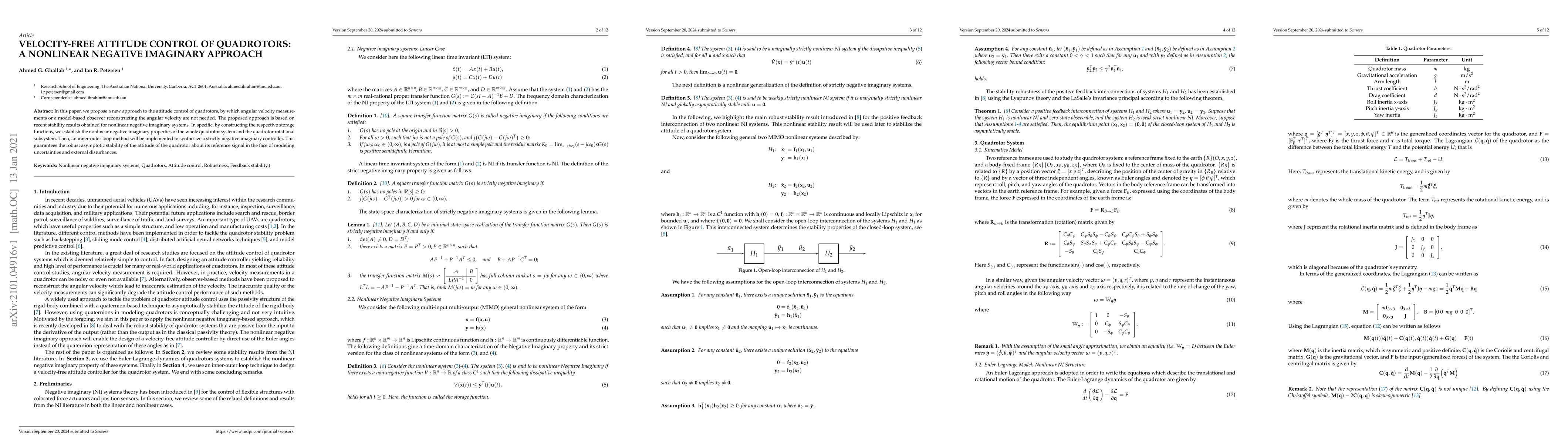 This paper introduces a novel velocity-free attitude control method for quadrotors using a nonlinear negative imaginary approach, eliminating the need for angular velocity measurements. It leverages stability results for negative imaginary systems to ensure robust asymptotic stability of the quadrotor's attitude despite uncertainties and disturbances.