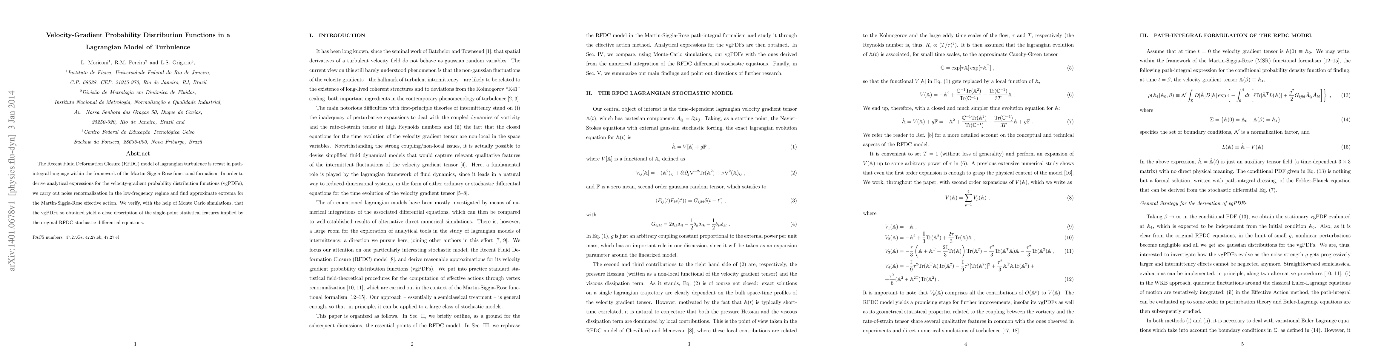 The Recent Fluid Deformation Closure (RFDC) model of lagrangian turbulence is recast in path-integral language within the framework of the Martin-Siggia-Rose functional formalism. In order to derive analytical expressions for the velocity-gradient probability distribution functions (vgPDFs), we carry out noise renormalization in the low-frequency regime and find approximate extrema for the Martin-Siggia-Rose effective action. We verify, with the help of Monte Carlo simulations, that the vgPDFs so obtained yield a close description of the single-point statistical features implied by the original RFDC stochastic differential equations.