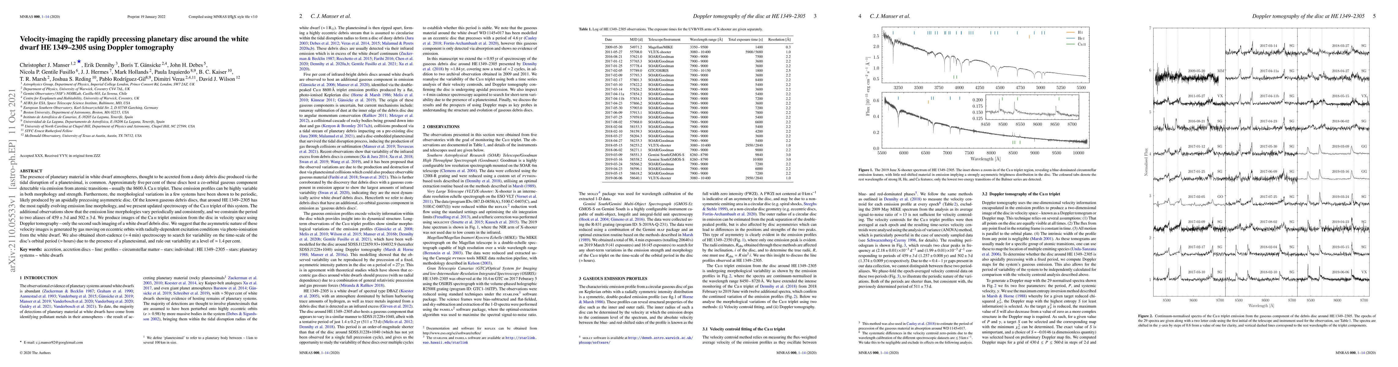 The presence of planetary material in white dwarf atmospheres, thought to be accreted from a dusty debris disc produced via the tidal disruption of a planetesimal, is common. Approximately five per cent of these discs host a co-orbital gaseous component detectable via emission from atomic transitions - usually the 8600 Angstrom CaII triplet. These emission profiles can be highly variable in both morphology and strength. Furthermore, the morphological variations in a few systems have been shown to be periodic, likely produced by an apsidally precessing asymmetric disc. Of the known gaseous debris discs, that around HE1349-2305 has the most rapidly evolving emission line morphology, and we present updated spectroscopy of the CaII triplet of this system. The additional observations show that the emission line morphologies vary periodically and consistently, and we constrain the period to two aliases of 459$\pm$3d and 502$\pm$3d. We produce images of the CaII triplet emission from the disc in velocity space using Doppler tomography - only the second such imaging of a white dwarf debris disc. We suggest that the asymmetric nature of these velocity images is generated by gas moving on eccentric orbits with radially-dependent excitation conditions via photo-ionisation from the white dwarf. We also obtained short-cadence (~ 4 min) spectroscopy to search for variability on the time-scale of the disc's orbital period (~ hours) due to the presence of a planetesimal, and rule out variability at a level of ~ 1.4 per cent.