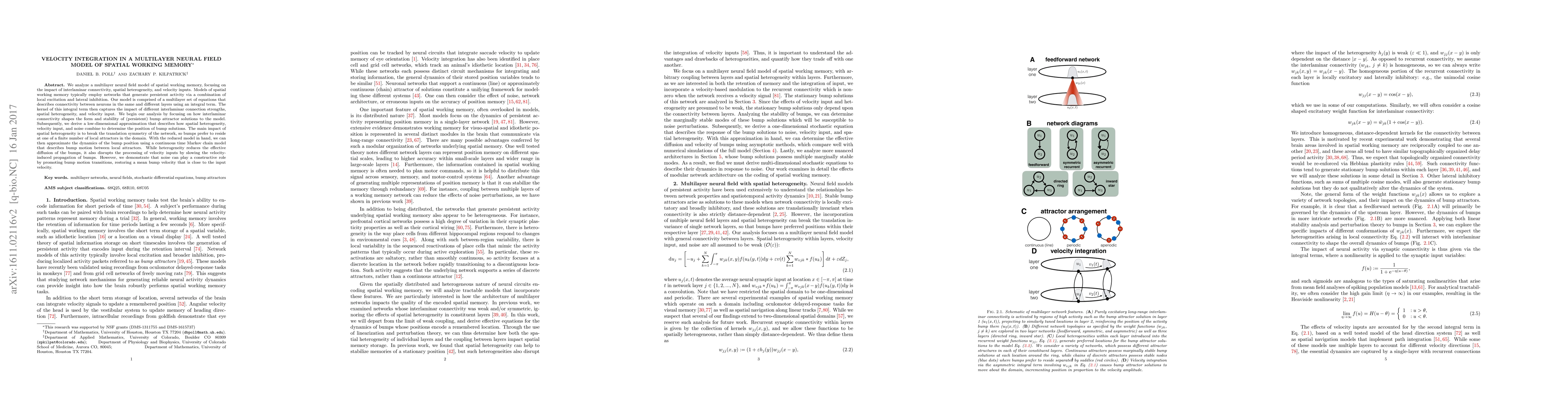 We analyze a multilayer neural field model of spatial working memory, focusing on the impact of interlaminar connectivity, spatial heterogeneity, and velocity inputs. Models of spatial working memory typically employ networks that generate persistent activity via a combination of local excitation and lateral inhibition. Our model is comprised of a multilayer set of equations that describes connectivity between neurons in the same and different layers using an integral term. The kernel of this integral term then captures the impact of different interlaminar connection strengths, spatial heterogeneity, and velocity input. We begin our analysis by focusing on how interlaminar connectivity shapes the form and stability of (persistent) bump attractor solutions to the model. Subsequently, we derive a low-dimensional approximation that describes how spatial heterogeneity, velocity input, and noise combine to determine the position of bump solutions. The main impact of spatial heterogeneity is to break the translation symmetry of the network, so bumps prefer to reside at one of a finite number of local attractors in the domain. With the reduced model in hand, we can then approximate the dynamics of the bump position using a continuous time Markov chain model that describes bump motion between local attractors. While heterogeneity reduces the effective diffusion of the bumps, it also disrupts the processing of velocity inputs by slowing the velocity-induced propagation of bumps. However, we demonstrate that noise can play a constructive role by promoting bump motion transitions, restoring a mean bump velocity that is close to the input velocity.