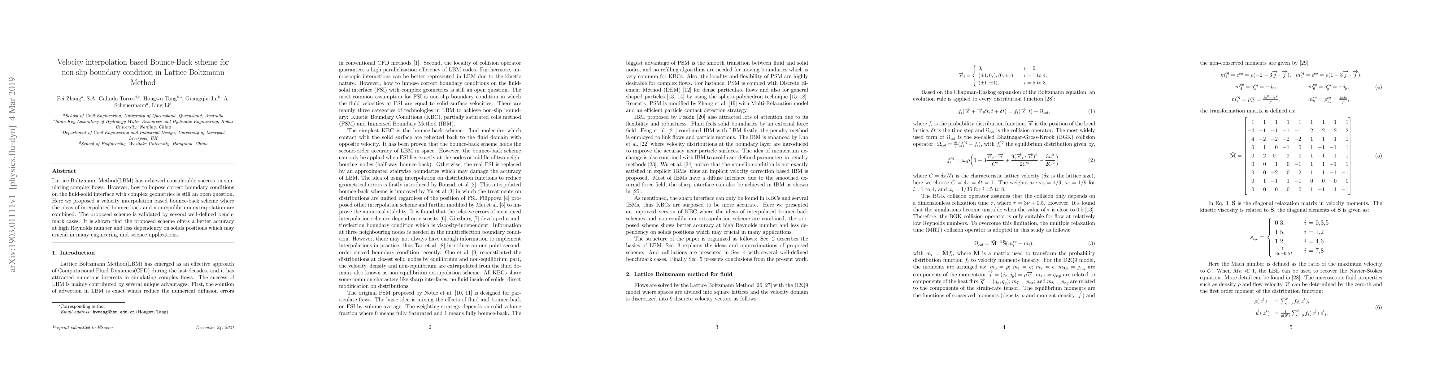 This paper proposes a velocity interpolation based bounce-back scheme for the Lattice Boltzmann Method (LBM) to accurately impose non-slip boundary conditions on fluid-solid interfaces. The method combines interpolated bounce-back and non-equilibrium extrapolation, demonstrating improved accuracy at high Reynolds numbers and reduced dependency on solid positions.