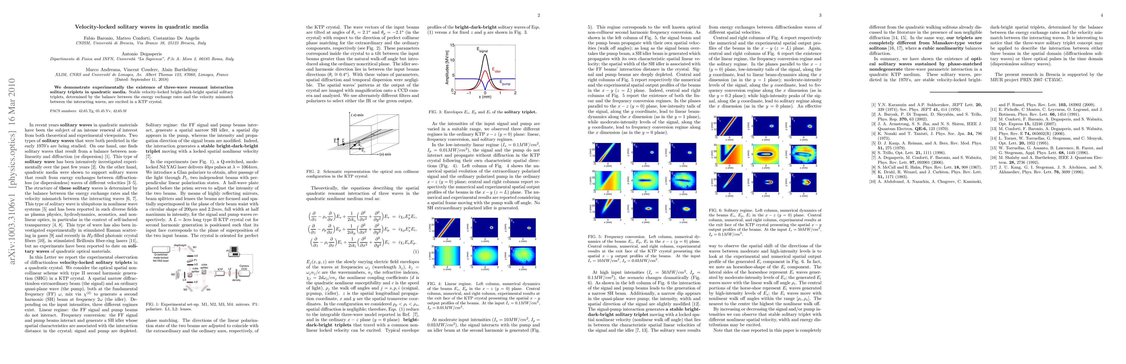 Summary: This research experimentally verifies the existence of stable, velocity-locked solitary wave triplets in quadratic media, specifically bright-dark-bright configurations in a KTP crystal, through three-wave resonant interactions. The stability arises from the balance between energy exchange and velocity mismatch among the interacting waves.