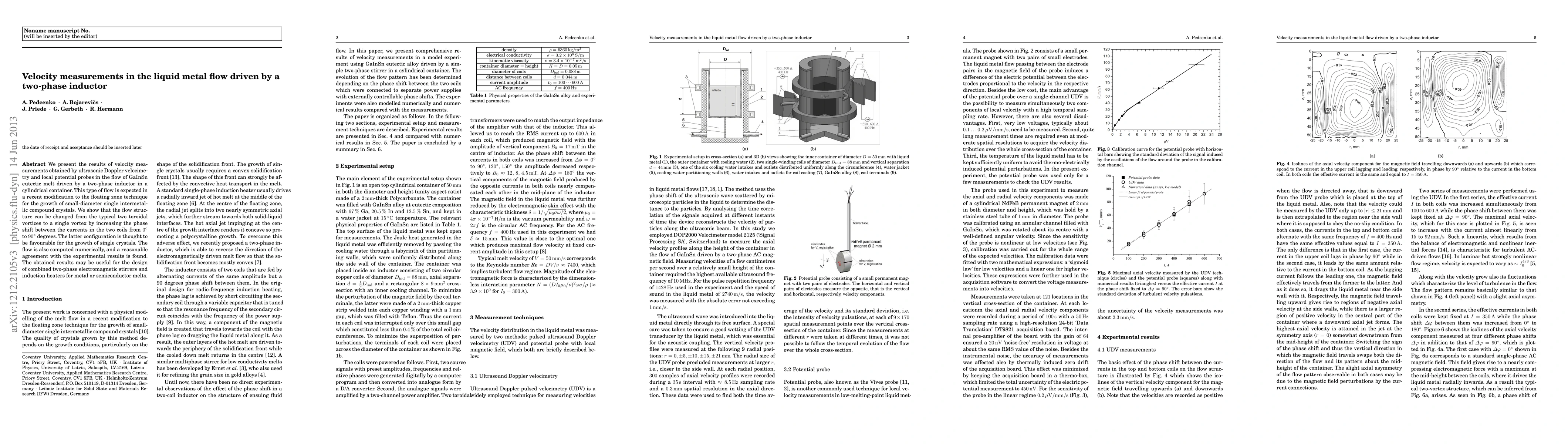 This study measures the velocity of GaInSn eutectic melt flow driven by a two-phase inductor using ultrasonic Doppler velocimetry and local potential probes. The flow structure can be altered from two toroidal vortices to a single vortex by adjusting the phase shift, which is beneficial for single crystal growth.