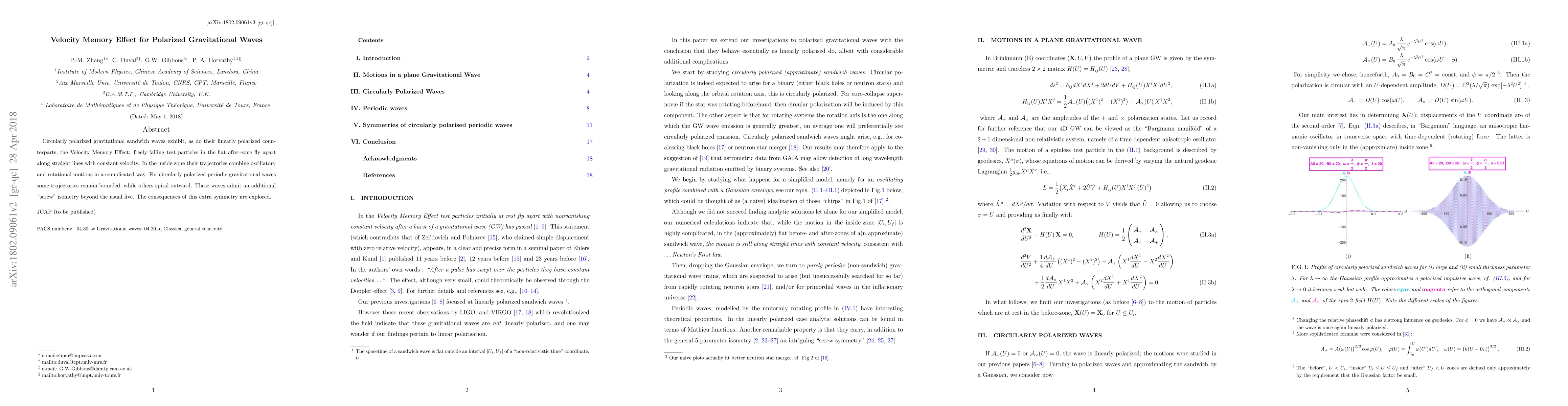 Circularly polarized gravitational sandwich waves exhibit, as do their linearly polarized counterparts, the Velocity Memory Effect: freely falling test particles in the flat after-zone fly apart along straight lines with constant velocity. In the inside zone their trajectories combine oscillatory and rotational motions in a complicated way. For circularly polarized periodic gravitational waves some trajectories remain bounded, while others spiral outward. These waves admit an additional "screw" isometry beyond the usual five. The consequences of this extra symmetry are explored.