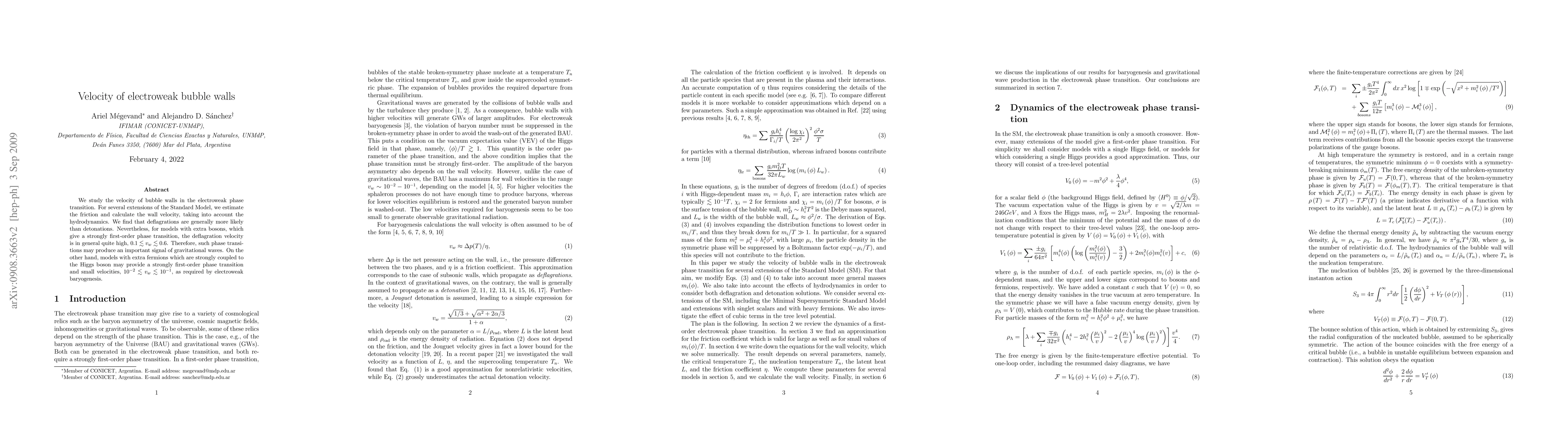This paper investigates the velocity of bubble walls during the electroweak phase transition in various extensions of the Standard Model, finding that deflagrations are more common than detonations. For models with extra bosons, high bubble wall velocities (0.1 ≤ v_w ≤ 0.6) are likely, potentially generating significant gravitational wave signals. Conversely, models with extra fermions strongly coupled to the Higgs yield lower velocities (10^-2 ≤ v_w ≤ 10^-1), suitable for electroweak baryogenesis.