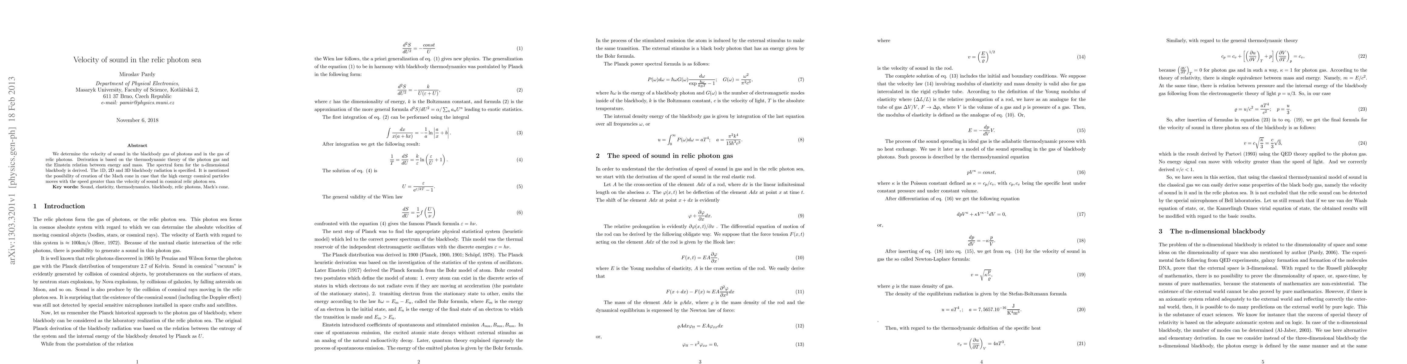 We determine the velocity of sound in the blackbody gas of photons and in the gas of relic photons. Derivation is based on the thermodynamic theory of the photon gas and the Einstein relation between energy and mass. The spectral form for the n-dimensional blackbody is derived. The 1D, 2D and 3D blackbody radiation is specified. It is mentioned the possibility of creation of the Mach cone in case that the high energy cosmical particles moves with the speed greater than the velocity of sound in cosmical relic photon sea. Key words: Sound, elasticity, thermodynamics, blackbody, relic photons, Mach's cone.