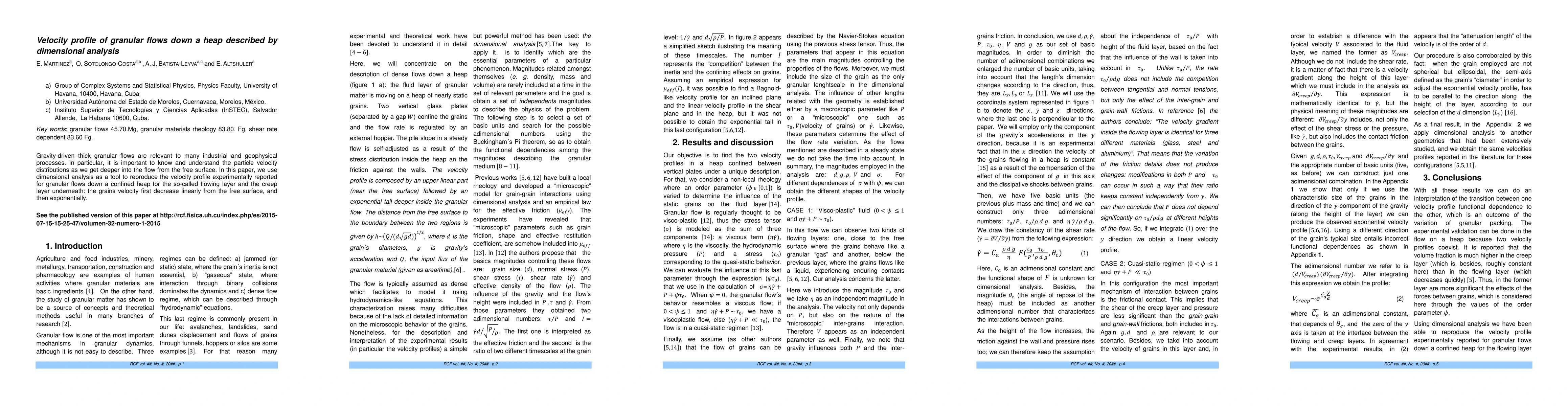 This paper employs dimensional analysis to describe the velocity profile of gravity-driven granular flows down a heap, showing that grain velocity decreases linearly from the free surface and then exponentially in the flowing and creep layers.