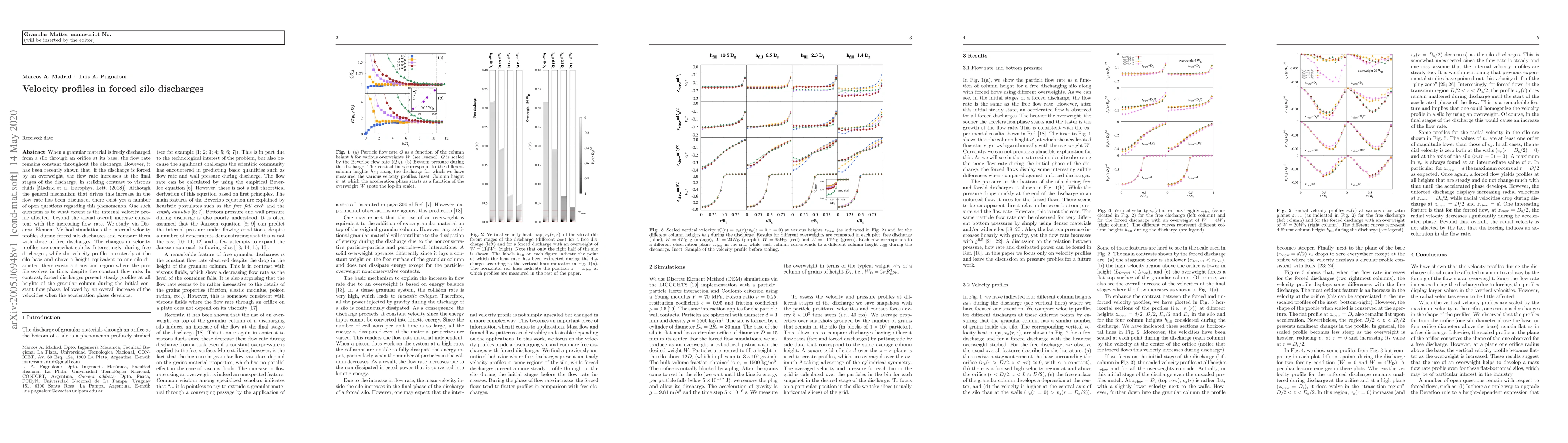 When a granular material is freely discharged from a silo through an orifice at its base, the flow rate remains constant throughout the discharge. However, it has been recently shown that, if the discharge is forced by an overweight, the flow rate increases at the final stages of the discharge, in striking contrast to viscous fluids [Madrid et al. Europhys. Lett. (2018)]. {Although the general mechanism that drives this increase in the flow rate has been discussed, there exist yet a number of open questions regarding this phenomenon. One such questions is to what extent is the internal velocity profile affected, beyond the trivial overall increase consistent with the increasing flow rate.} We study via Discrete Element Method simulations the internal velocity profiles during forced silo discharges and compare them with those of free discharges. The changes in velocity profiles are somewhat subtle. Interestingly, during free discharges, while the velocity profiles are steady at the silo base and above a height equivalent to one silo diameter, there exists a transition region where the profile evolves in time, despite the constant flow rate. In contrast, forced discharges present steady profiles at all heights of the granular column during the initial constant flow phase, followed by an overall increase of the velocities when the acceleration phase develops.