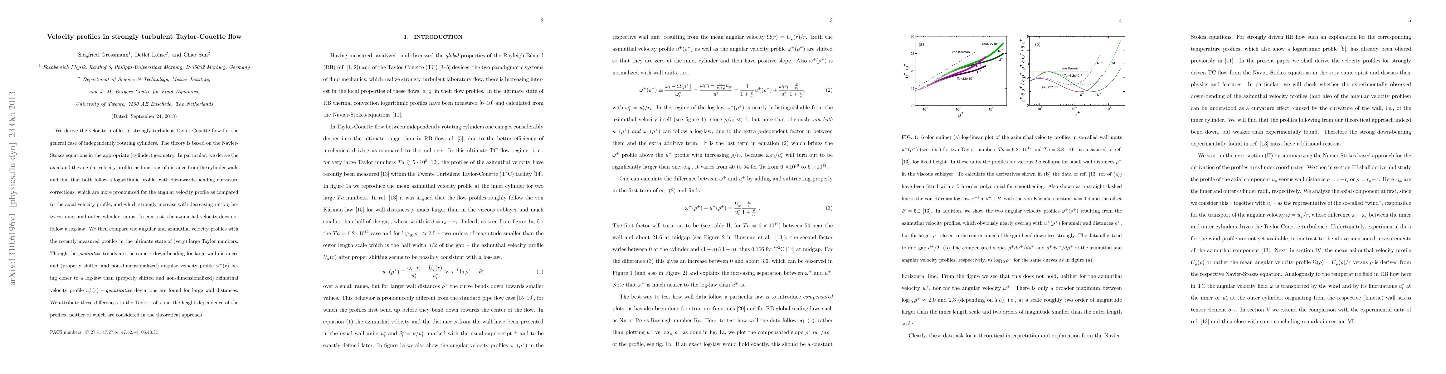 This paper derives velocity profiles for strongly turbulent Taylor-Couette flow, finding that both axial and angular velocities follow logarithmic profiles with curvature corrections, while azimuthal velocity does not. Comparisons with experimental data reveal qualitative agreement but quantitative deviations attributed to Taylor rolls and height dependence.