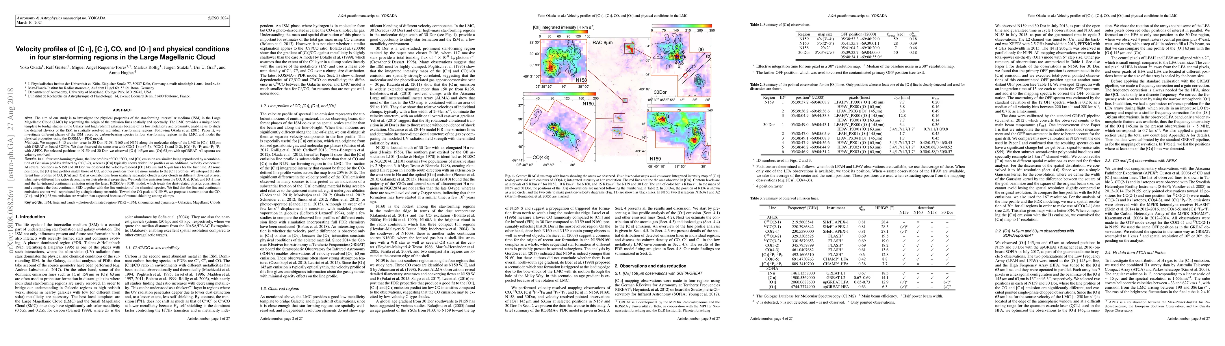 This study investigates the physical properties of the interstellar medium in four star-forming regions in the LMC using spatially and spectrally resolved observations of [CII], [CI], CO, and [OI] lines. The findings suggest that different line profiles indicate contributions from spatially separated clouds or clouds in different physical phases, and the KOSMA-tau PDR model is used to model the observed emissions.