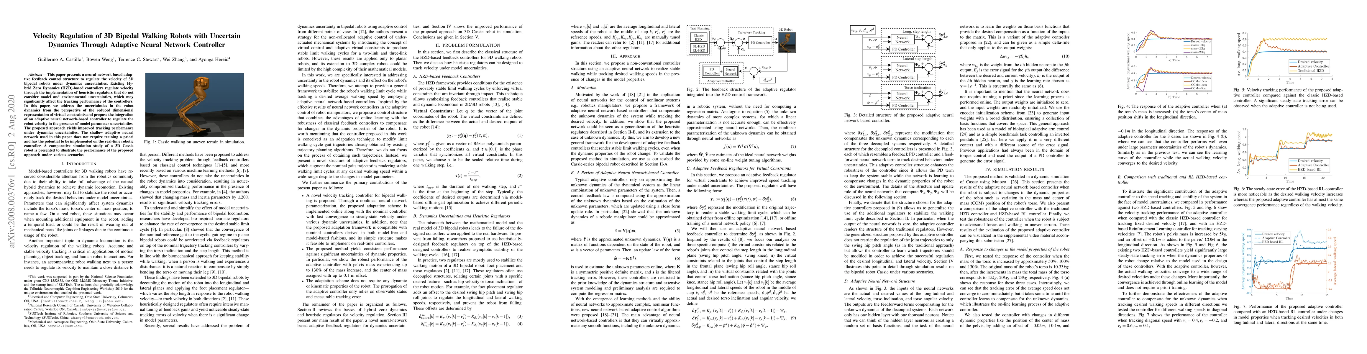 This paper proposes an adaptive neural network controller to regulate the velocity of 3D bipedal walking robots, addressing uncertainties in dynamics through a reduced-dimensional representation of virtual constraints. The approach improves tracking performance compared to existing heuristic regulators, with the neural network requiring no a priori training.