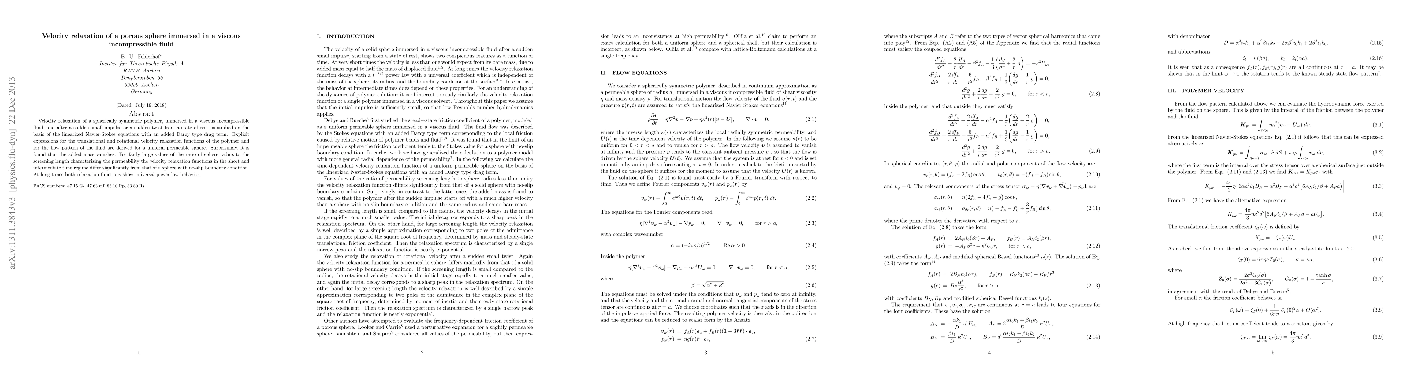 This paper studies the velocity relaxation of a porous polymer sphere in a viscous incompressible fluid using linearized Navier-Stokes equations with Darcy drag. It finds that the added mass vanishes, and the relaxation functions differ significantly from non-permeable spheres for short to intermediate times, while showing universal power law behavior at long times.