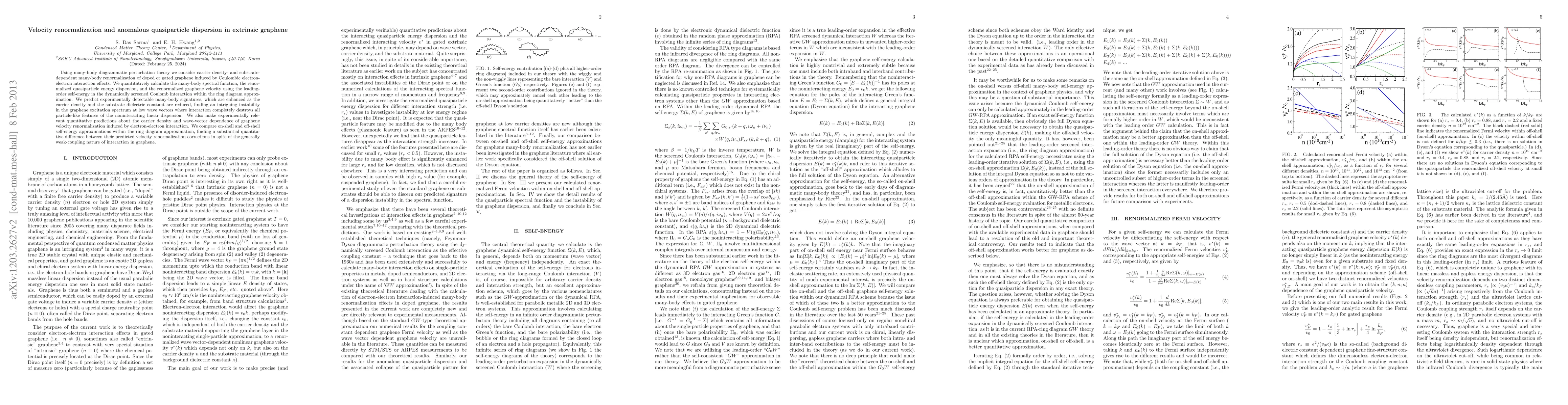 The paper presents a detailed analysis of velocity renormalization and anomalous quasiparticle dispersion in extrinsic graphene using many-body perturbation theory, providing a comprehensive comparison between on-shell and off-shell self-energy approximations.