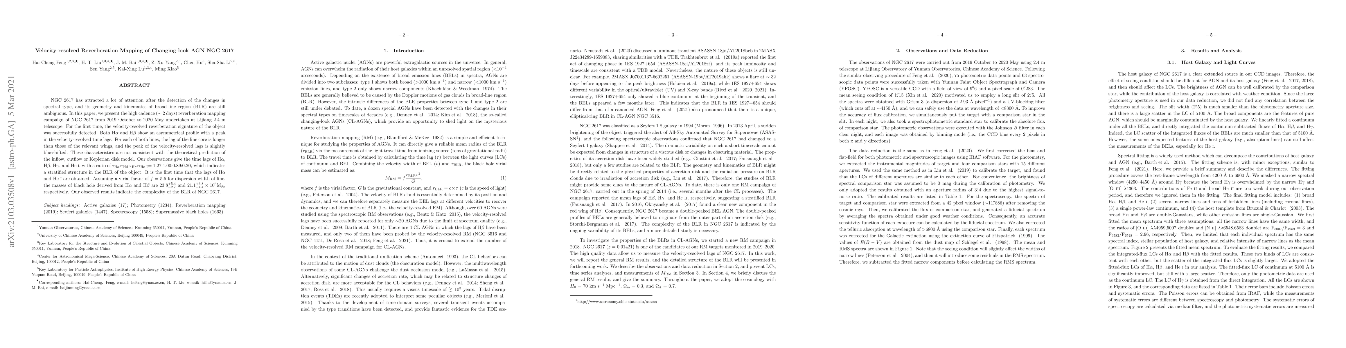 NGC 2617 has attracted a lot of attention after the detection of the changes in spectral type, and its geometry and kinematics of broad-line region (BLR) are still ambiguous. In this paper, we present the high cadence ($\sim$ 2 days) reverberation mapping campaign of NGC 2617 from 2019 October to 2020 May undertaken at Lijiang 2.4 m telescope. For the first time, the velocity-resolved reverberation signature of the object was successfully detected. Both H$\alpha$ and H$\beta$ show an asymmetrical profile with a peak in the velocity-resolved time lags. For each of both lines, the lag of the line core is longer than those of the relevant wings, and the peak of the velocity-resolved lags is slightly blueshifted. These characteristics are not consistent with the theoretical prediction of the inflow, outflow or Keplerian disk model. Our observations give the time lags ofH$\alpha$, H$\beta$, H$\gamma$, and He I, with a ratio of $\tau_{\rm{H}\alpha}$:$\tau_{\rm{H}\beta}$:$\tau_{\rm{H}\gamma}$:$\tau_{\rm{He~I}}$ = 1.27:1.00:0.89:0.20, which indicates a stratified structure in the BLR of the object. It is the first time that the lags of H$\alpha$ and He I are obtained. Assuming a virial factor of $f$ = 5.5 for dispersion width of line, the masses of black hole derived from H$\alpha$ and H$\beta$ are $\rm{23.8^{+5.4}_{-2.7}}$ and $\rm{21.1^{+3.8}_{-4.4}} \times 10^{6}M_{\odot}$, respectively. Our observed results indicate the complexity of the BLR of NGC 2617.