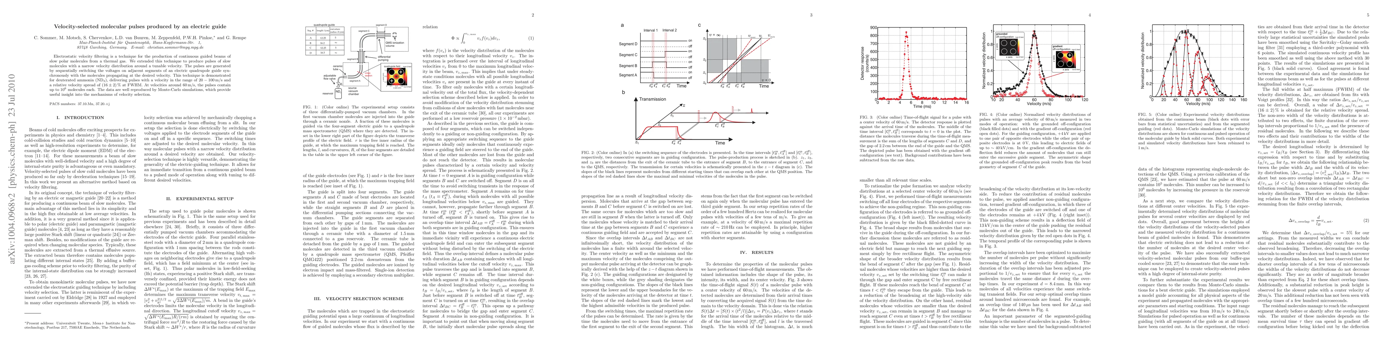 This paper presents a method for generating velocity-selected pulses of slow polar molecules using electrostatic velocity filtering and an electric guide. The technique produces pulses of deuterated ammonia with a narrow velocity distribution, validated by Monte-Carlo simulations.