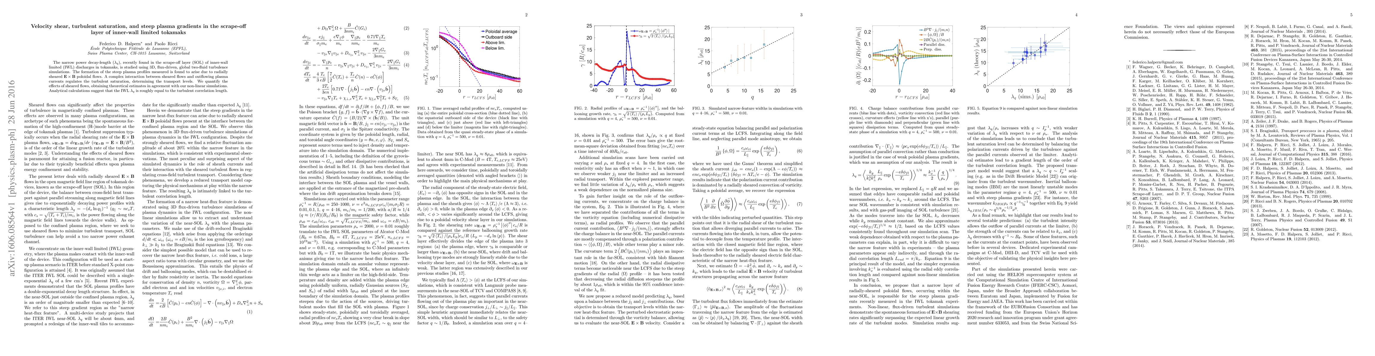 This paper investigates the narrow power decay-length in the scrape-off layer of inner-wall limited tokamaks using 3D turbulence simulations, finding that steep plasma profiles result from radially sheared $\vec{E}\times\vec{B}$ flows, with turbulent saturation and transport levels regulated by interactions between these flows and plasma currents.