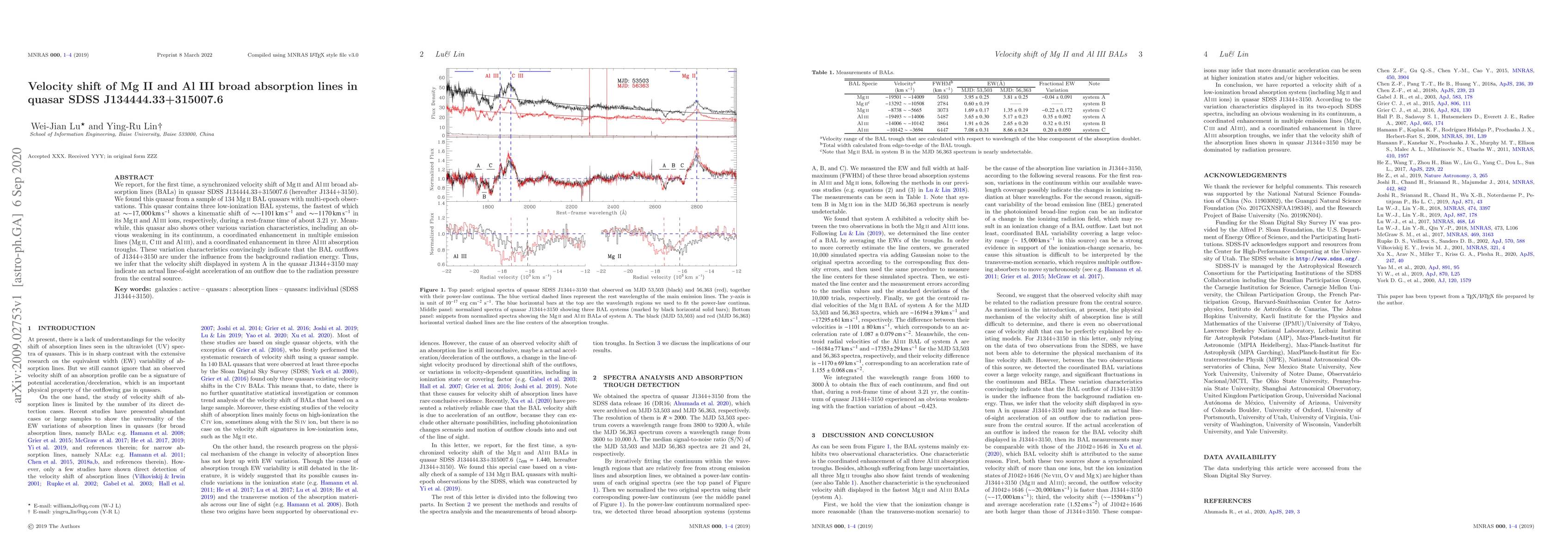 This study reports a synchronized velocity shift in Mg II and Al III broad absorption lines in quasar J1344+3150, indicating a kinematic shift likely due to radiation pressure from the central source. The quasar also shows coordinated variations in continuum and emission lines, suggesting influence from background radiation energy.