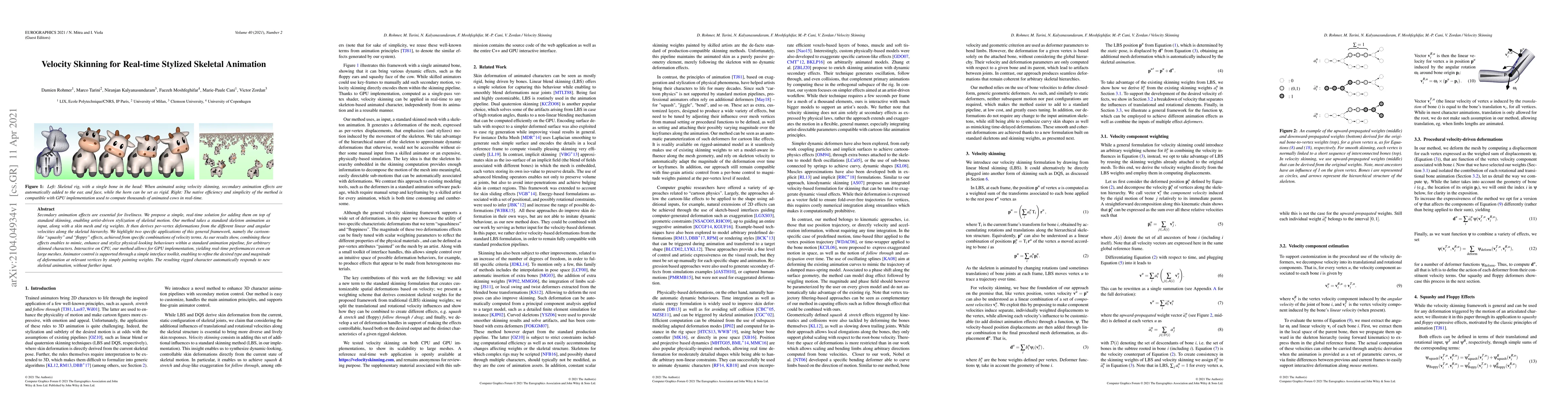 This paper proposes a real-time method for adding secondary animation effects to standard skeletal animation, enabling stylized deformations based on vertex velocities. It allows animators to refine effects like "squashy" and "floppy" through a simple interface, achieving interactive performance on CPU and real-time on GPU.