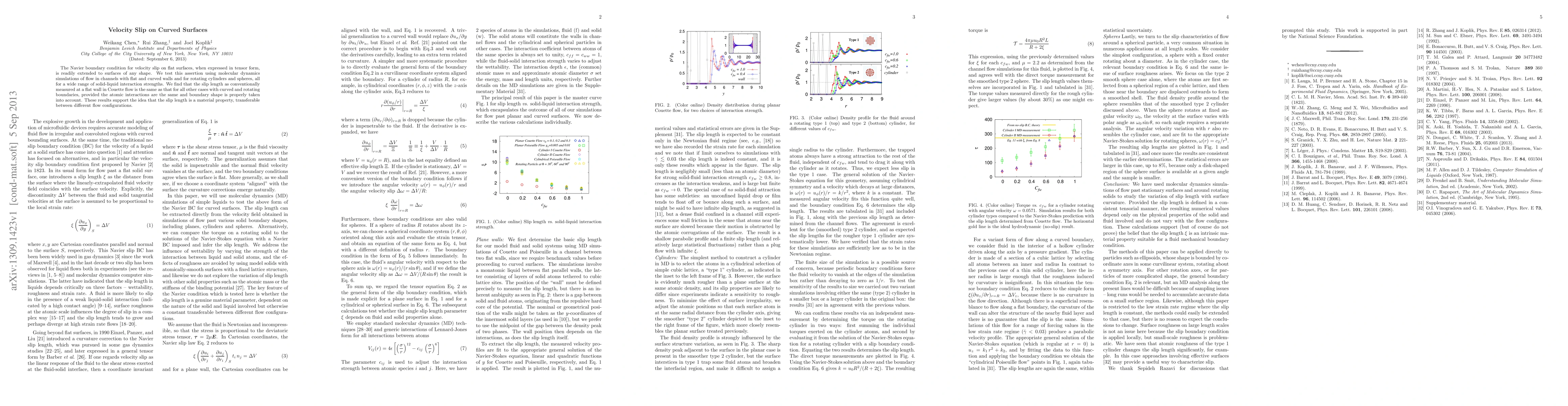 The Navier boundary condition for velocity slip is shown to be applicable across various surface geometries through molecular dynamics simulations. The slip length remains consistent across flat, curved, and rotating boundaries, confirming it as a material property independent of flow configuration.
