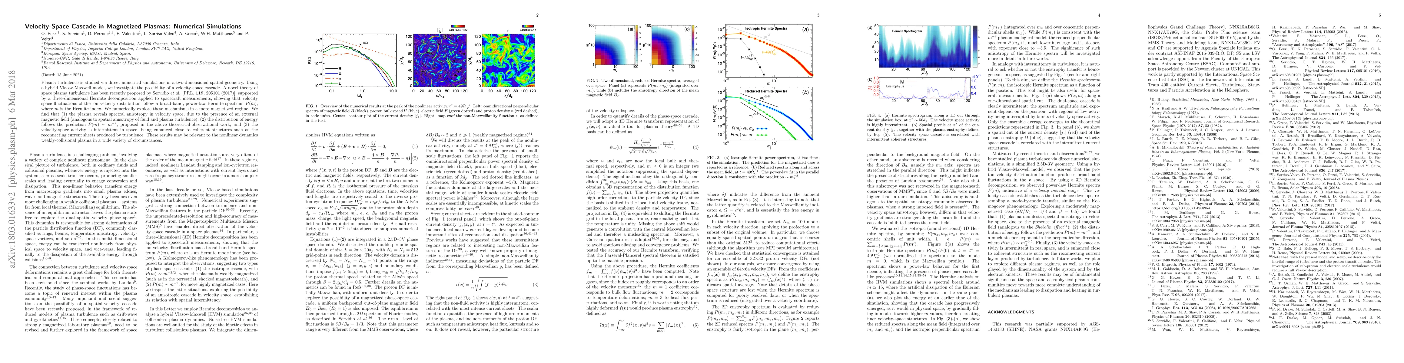 Plasma turbulence is studied via direct numerical simulations in a two-dimensional spatial geometry. Using a hybrid Vlasov-Maxwell model, we investigate the possibility of a velocity-space cascade. A novel theory of space plasma turbulence has been recently proposed by Servidio {\it et al.} [PRL, {\bf 119}, 205101 (2017)], supported by a three-dimensional Hermite decomposition applied to spacecraft measurements, showing that velocity space fluctuations of the ion velocity distribution follow a broad-band, power-law Hermite spectrum $P(m)$, where $m$ is the Hermite index. We numerically explore these mechanisms in a more magnetized regime. We find that (1) the plasma reveals spectral anisotropy in velocity space, due to the presence of an external magnetic field (analogous to spatial anisotropy of fluid and plasma turbulence); (2) the distribution of energy follows the prediction $P(m)\sim m^{-2}$, proposed in the above theoretical-observational work; and (3) the velocity-space activity is intermittent in space, being enhanced close to coherent structures such as the reconnecting current sheets produced by turbulence. These results may be relevant to the nonlinear dynamics weakly-collisional plasma in a wide variety of circumstances.
