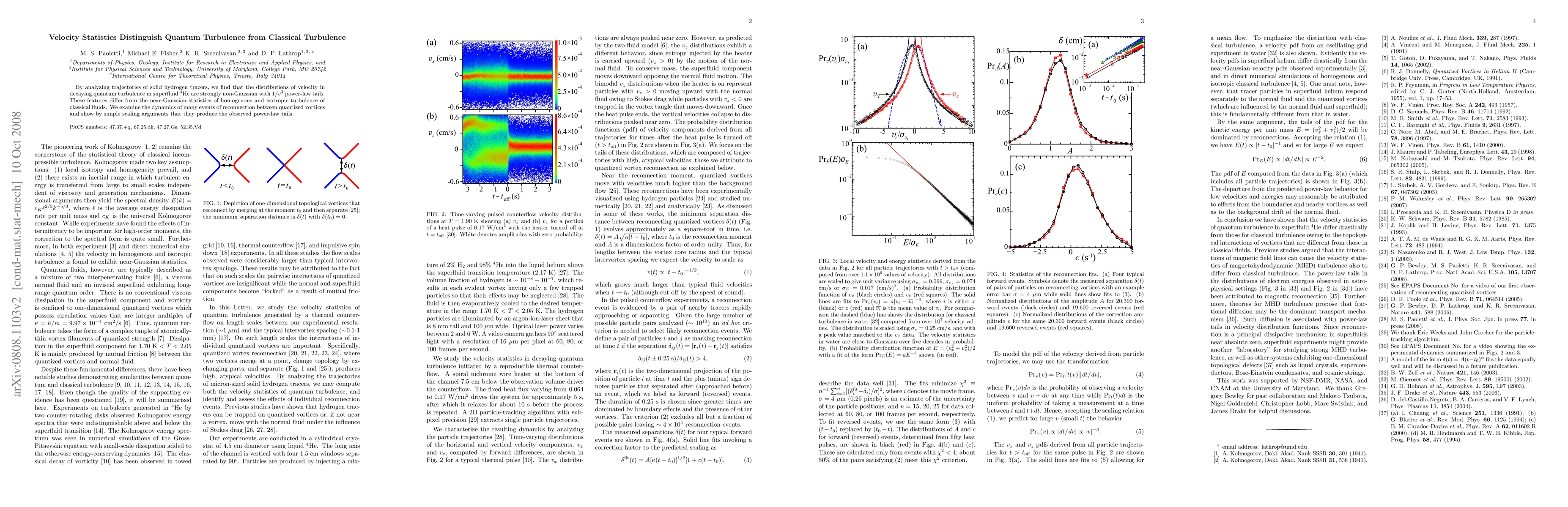 This study reveals that quantum turbulence in superfluid $^4$He exhibits strongly non-Gaussian velocity distributions with $1/v^3$ power-law tails, contrasting with the near-Gaussian statistics of classical fluid turbulence. The observed dynamics are attributed to reconnection events between quantized vortices.
