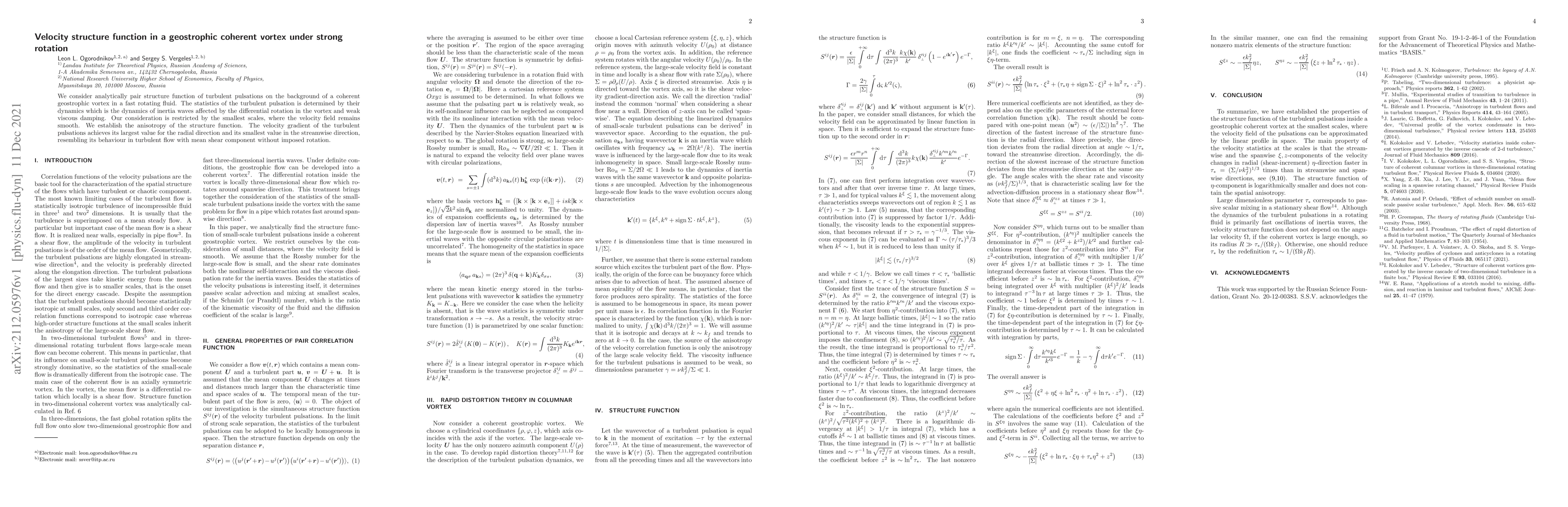 This study investigates the structure function of turbulent pulsations in a geostrophic coherent vortex under strong rotation, finding anisotropy and similarity to turbulent flow with mean shear component.