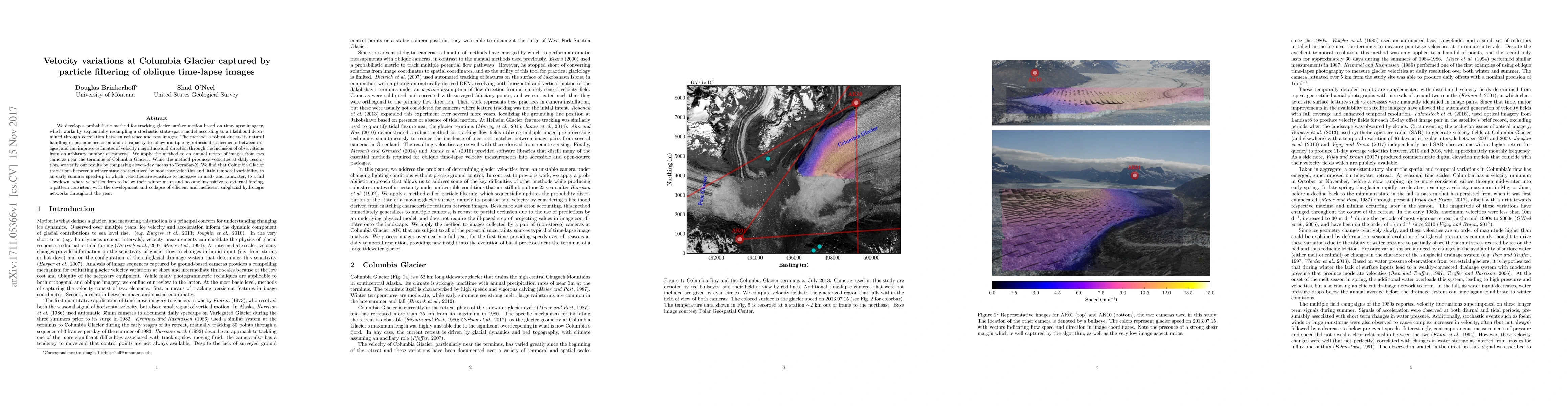 This paper introduces a probabilistic method for tracking glacier surface motion using particle filtering of time-lapse imagery, demonstrating its application to Columbia Glacier. The method effectively captures seasonal velocity variations, revealing a transition from winter to early summer speed-ups and fall slowdowns linked to subglacial hydrology.