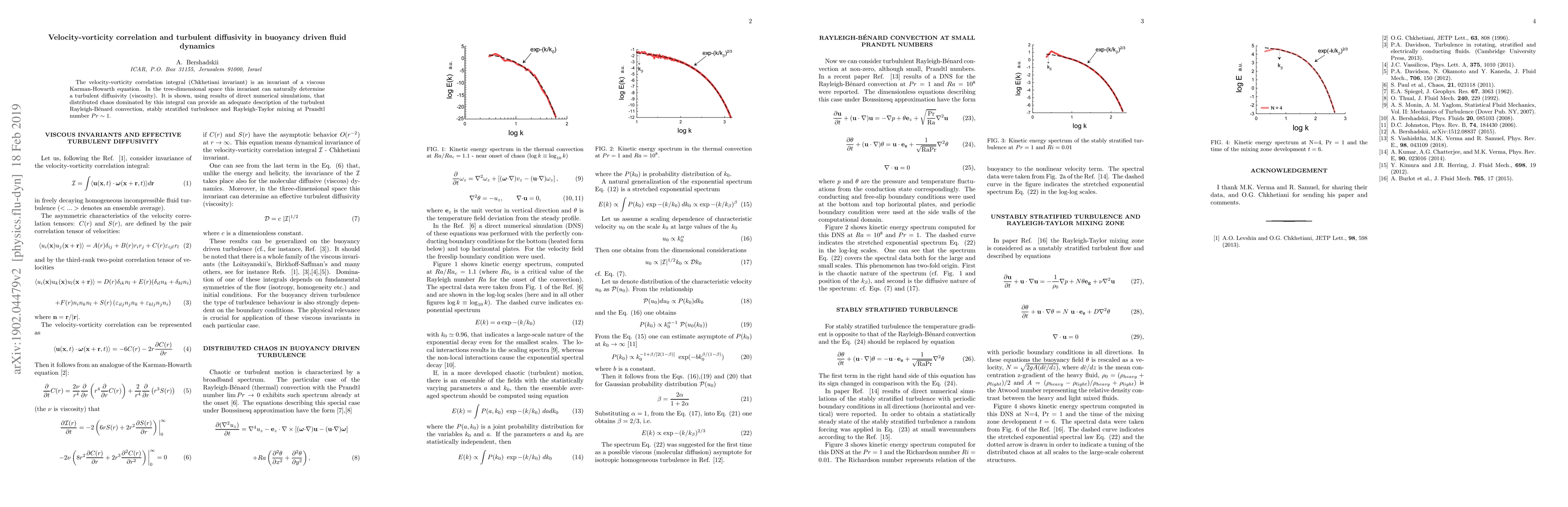 The velocity-vorticity correlation integral (Chkhetiani invariant) is an invariant of a viscous Karman-Howarth equation. In the tree-dimensional space this invariant can naturally determine a turbulent diffusivity (viscosity). It is shown, using results of direct numerical simulations, that distributed chaos dominated by this integral can provide an adequate description of the turbulent Rayleigh-B\'{e}nard convection, stably stratified turbulence and Rayleigh-Taylor mixing at Prandtl number $Pr \sim 1$.