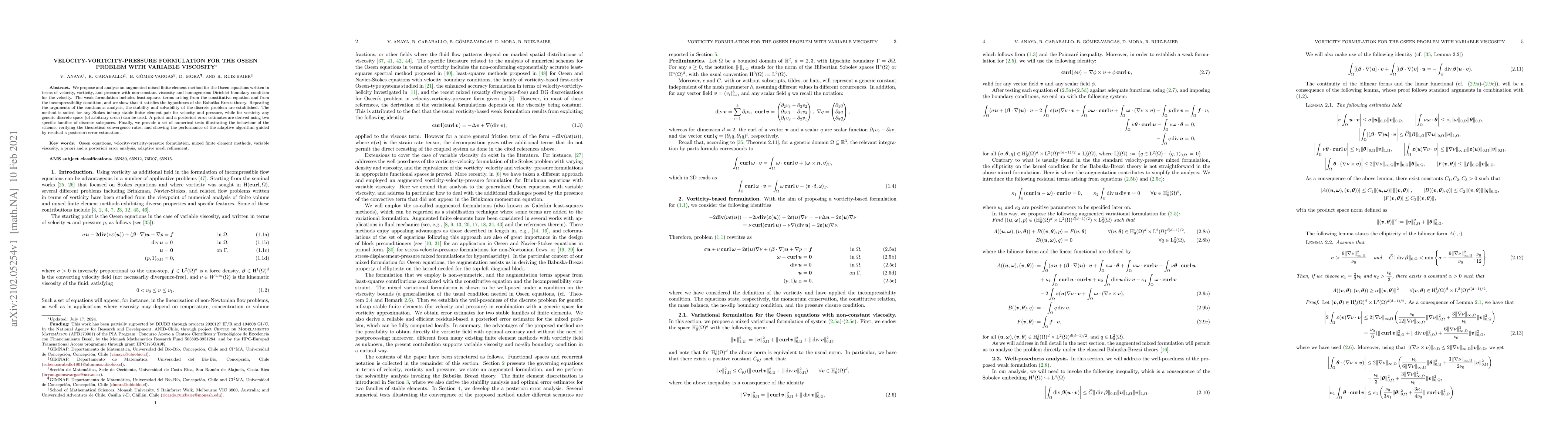 We propose and analyse an augmented mixed finite element method for the Oseen equations written in terms of velocity, vorticity, and pressure with non-constant viscosity and homogeneous Dirichlet boundary condition for the velocity. The weak formulation includes least-squares terms arising from the constitutive equation and from the incompressibility condition, and we show that it satisfies the hypotheses of the Babu\vska-Brezzi theory. Repeating the arguments of the continuous analysis, the stability and solvability of the discrete problem are established. The method is suited for any Stokes inf-sup stable finite element pair for velocity and pressure, while for vorticity any generic discrete space (of arbitrary order) can be used. A priori and a posteriori error estimates are derived using two specific families of discrete subspaces. Finally, we provide a set of numerical tests illustrating the behaviour of the scheme, verifying the theoretical convergence rates, and showing the performance of the adaptive algorithm guided by residual a posteriori error estimation.