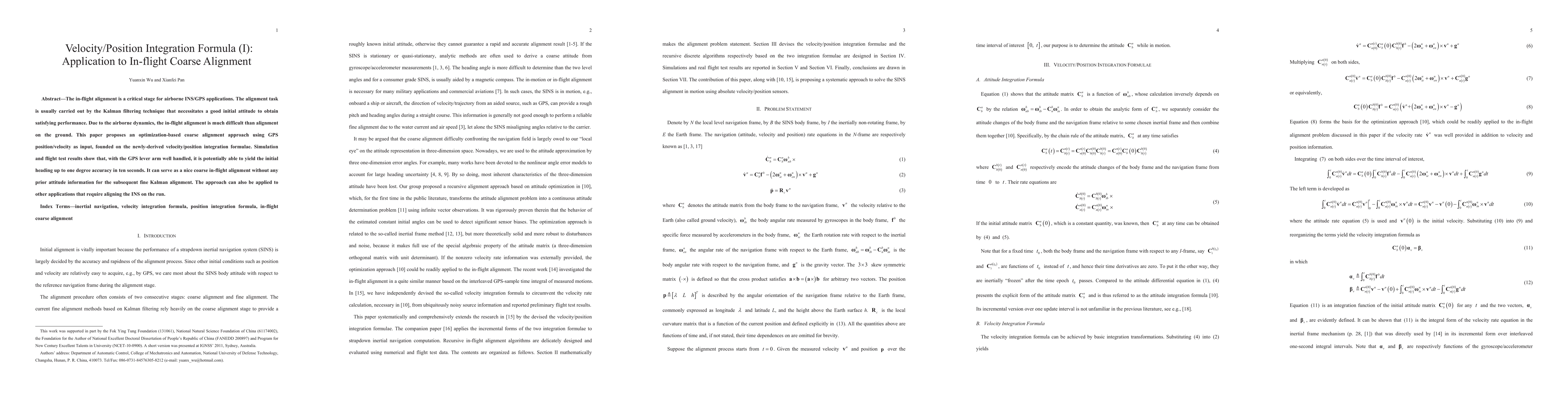 The in-flight alignment is a critical stage for airborne INS/GPS applications. The alignment task is usually carried out by the Kalman filtering technique that necessitates a good initial attitude to obtain satisfying performance. Due to the airborne dynamics, the in-flight alignment is much difficult than alignment on the ground. This paper proposes an optimization-based coarse alignment approach using GPS position/velocity as input, founded on the newly-derived velocity/position integration formulae. Simulation and flight test results show that, with the GPS lever arm well handled, it is potentially able to yield the initial heading up to one degree accuracy in ten seconds. It can serve as a nice coarse in-flight alignment without any prior attitude information for the subsequent fine Kalman alignment. The approach can also be applied to other applications that require aligning the INS on the run.