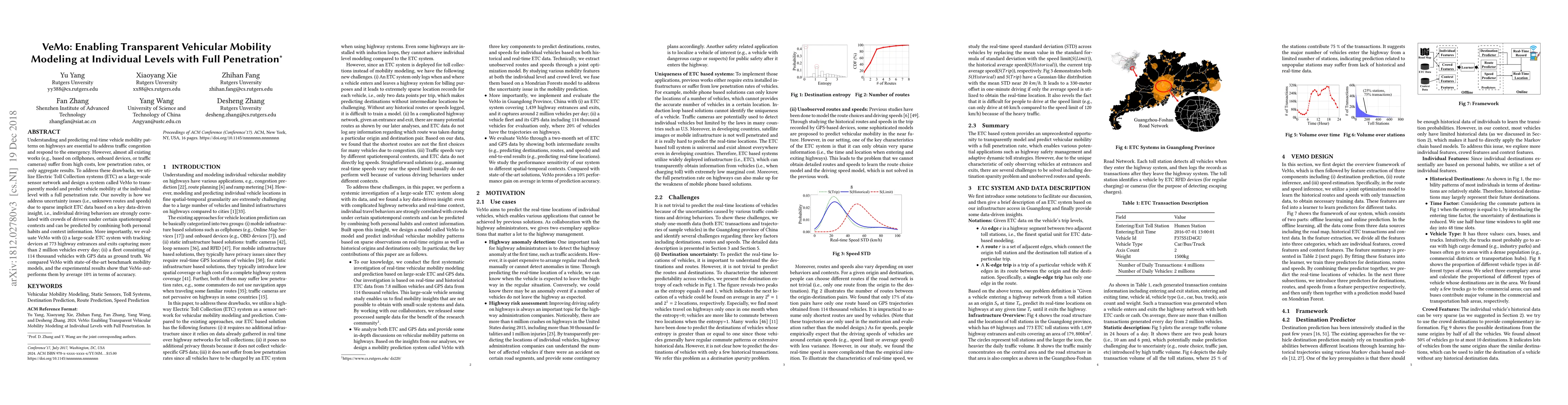 Understanding and predicting real-time vehicle mobility patterns on highways are essential to address traffic congestion and respond to the emergency. However, almost all existing works (e.g., based on cellphones, onboard devices, or traffic cameras) suffer from high costs, low penetration rates, or only aggregate results. To address these drawbacks, we utilize Electric Toll Collection systems (ETC) as a large-scale sensor network and design a system called VeMo to transparently model and predict vehicle mobility at the individual level with a full penetration rate. Our novelty is how we address uncertainty issues (i.e., unknown routes and speeds) due to sparse implicit ETC data based on a key data-driven insight, i.e., individual driving behaviors are strongly correlated with crowds of drivers under certain spatiotemporal contexts and can be predicted by combining both personal habits and context information. More importantly, we evaluate VeMo with (i) a large-scale ETC system with tracking devices at 773 highway entrances and exits capturing more than 2 million vehicles every day; (ii) a fleet consisting of 114 thousand vehicles with GPS data as ground truth. We compared VeMo with state-of-the-art benchmark mobility models, and the experimental results show that VeMo outperforms them by average 10% in terms of accuracy.