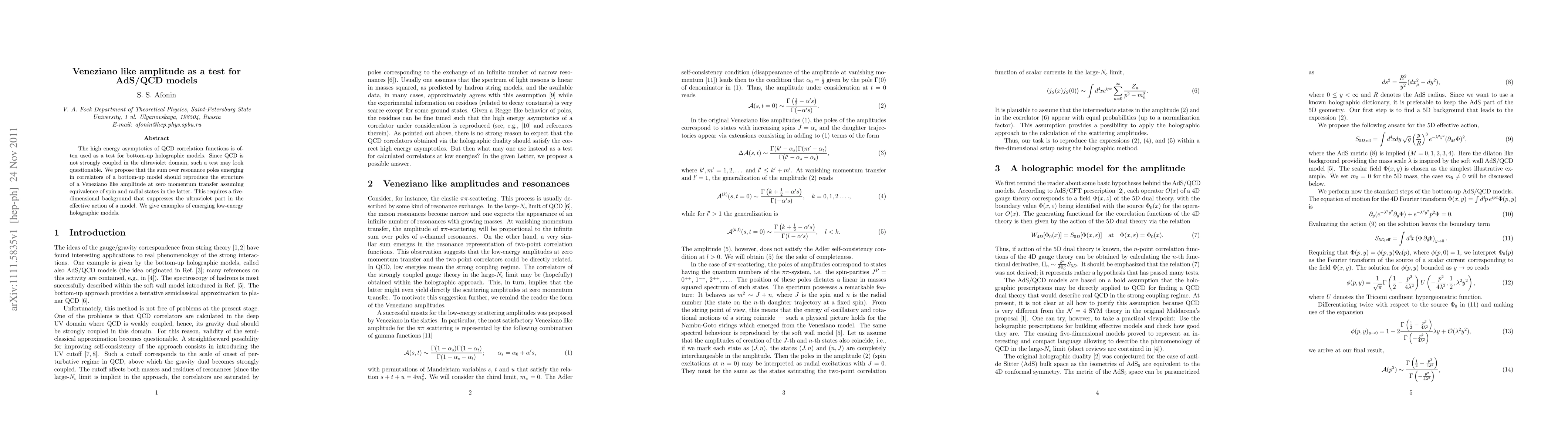 This paper proposes using Veneziano-like amplitudes to test AdS/QCD models by examining the sum over resonance poles in QCD correlation functions. It suggests that a five-dimensional background is necessary to suppress ultraviolet contributions, providing examples of low-energy holographic models that meet this criterion.