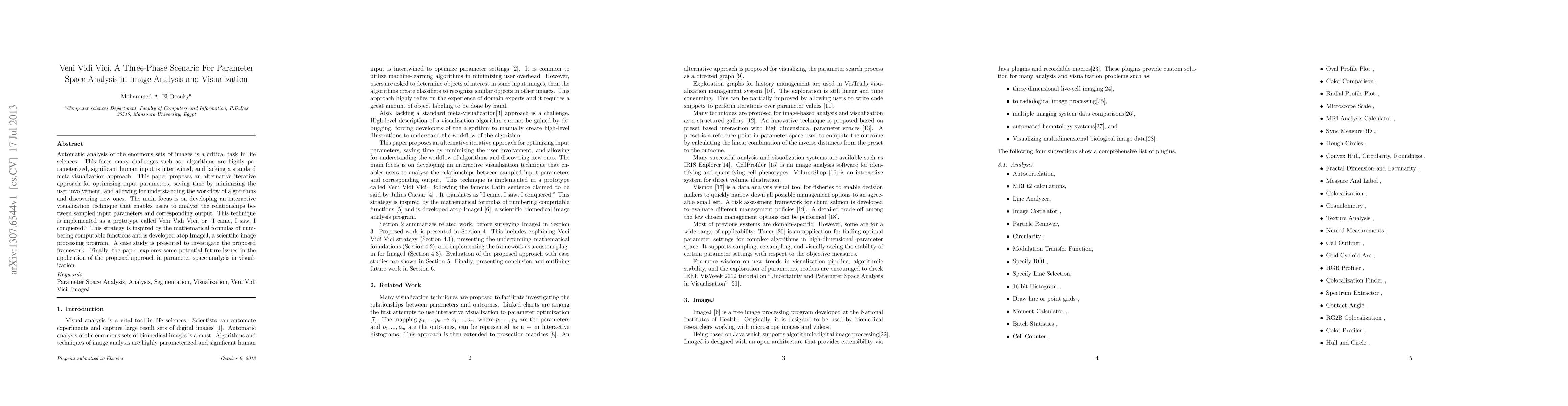 Automatic analysis of the enormous sets of images is a critical task in life sciences. This faces many challenges such as: algorithms are highly parameterized, significant human input is intertwined, and lacking a standard meta-visualization approach. This paper proposes an alternative iterative approach for optimizing input parameters, saving time by minimizing the user involvement, and allowing for understanding the workflow of algorithms and discovering new ones. The main focus is on developing an interactive visualization technique that enables users to analyze the relationships between sampled input parameters and corresponding output. This technique is implemented as a prototype called Veni Vidi Vici, or "I came, I saw, I conquered." This strategy is inspired by the mathematical formulas of numbering computable functions and is developed atop ImageJ, a scientific image processing program. A case study is presented to investigate the proposed framework. Finally, the paper explores some potential future issues in the application of the proposed approach in parameter space analysis in visualization.